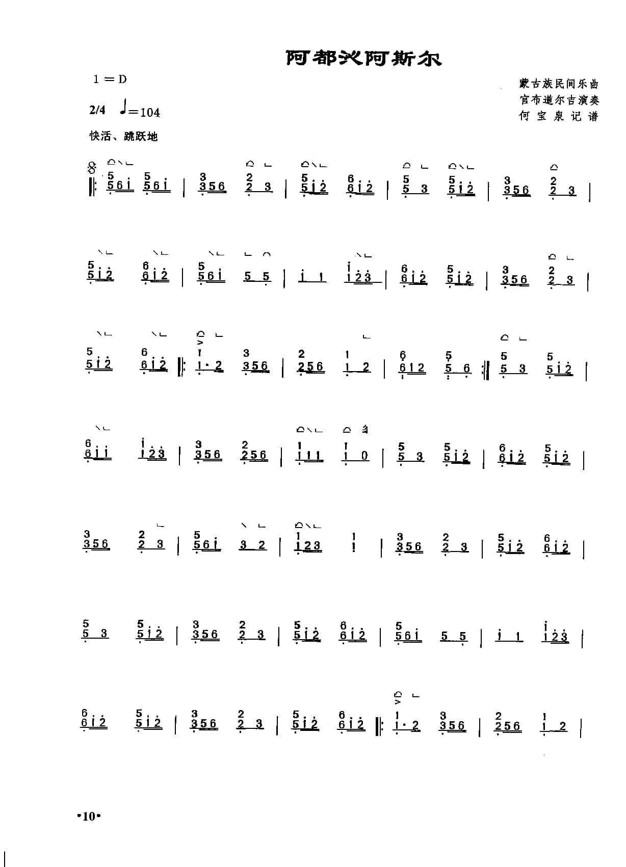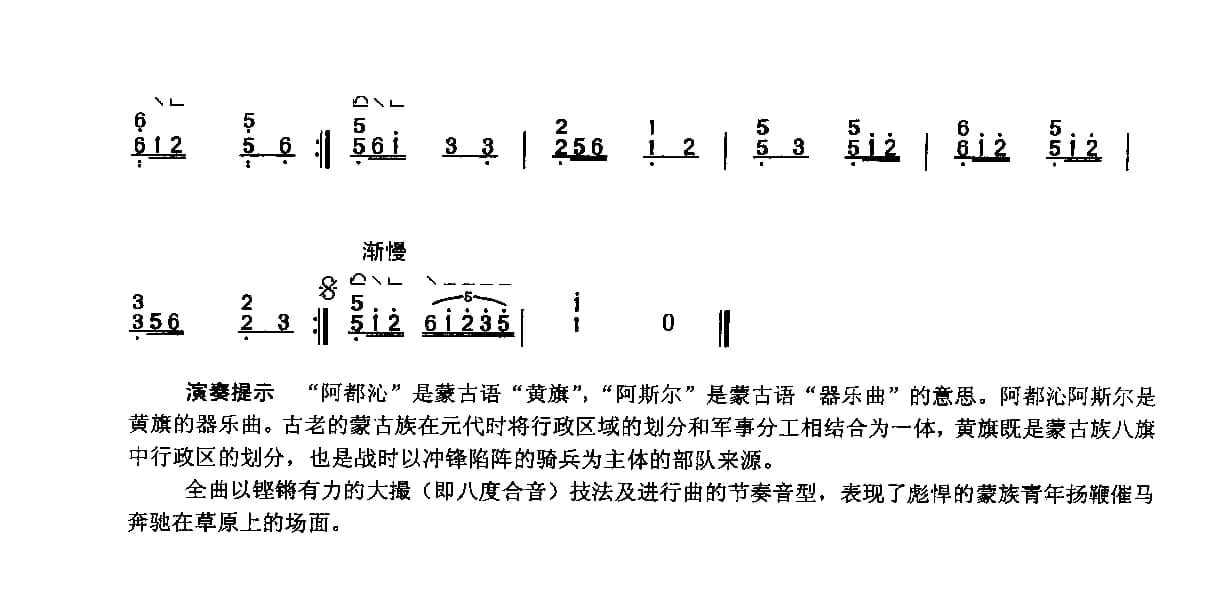 名称:古筝考级乐曲简谱: 阿都沁阿斯尔 蒙古族民间乐曲 官司布道尔吉演奏 何宝泉记谱 二级国家:蒙古分类:民族乐器谱子类:古筝谱类型:简谱文件格式:jpg古筝考级乐曲简谱: 阿都沁阿斯尔 蒙古族民间乐曲 官司布道尔吉演奏 何宝泉记谱(二级)