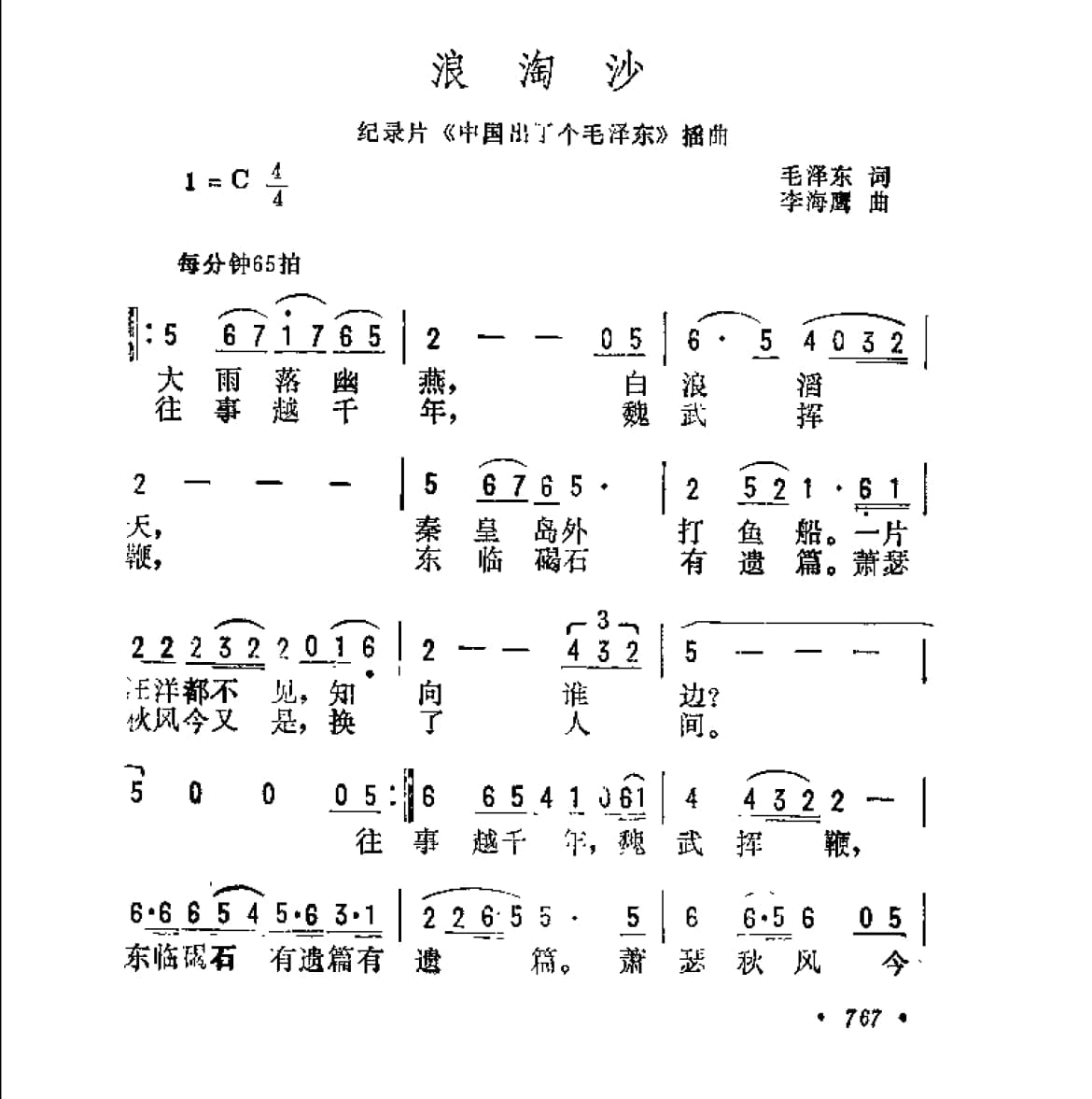 名称:浪淘沙 纪录片 中国出了个毛泽东 插曲 毛泽东词 李海鹰曲国家:中国分类:曲谱子类:投稿类型:简谱/五线谱文件格式:jpg