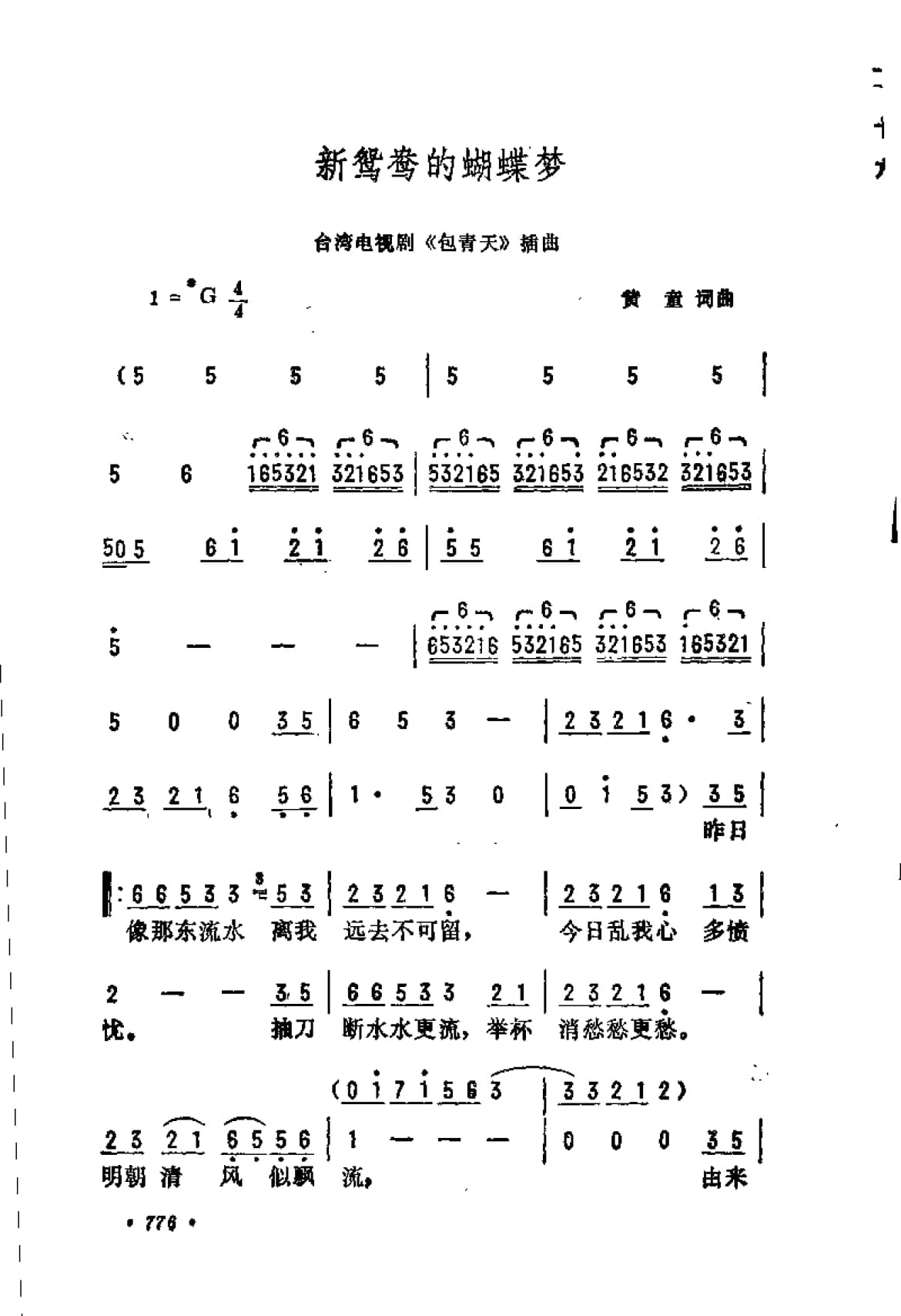 名称:新鸳鸯的蝴蝶梦 台湾电视剧 包青天 插曲 黄童词曲国家:中国分类:曲谱子类:投稿类型:简谱/五线谱文件格式:jpg