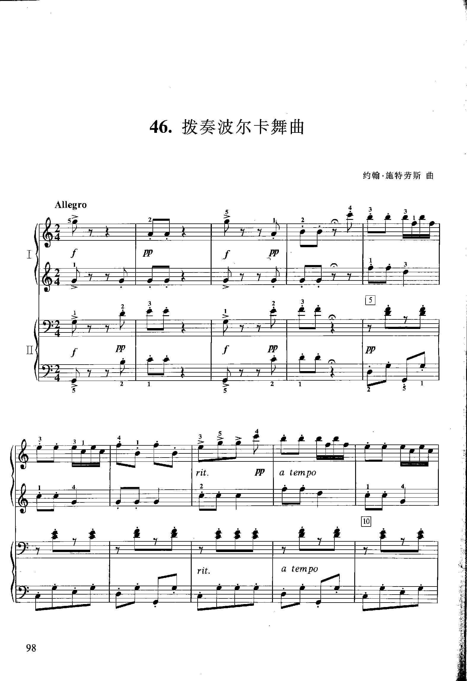 少儿钢琴四手联弹曲目:拨奏波尔卡舞曲 约翰·斯特劳斯曲(五线谱)