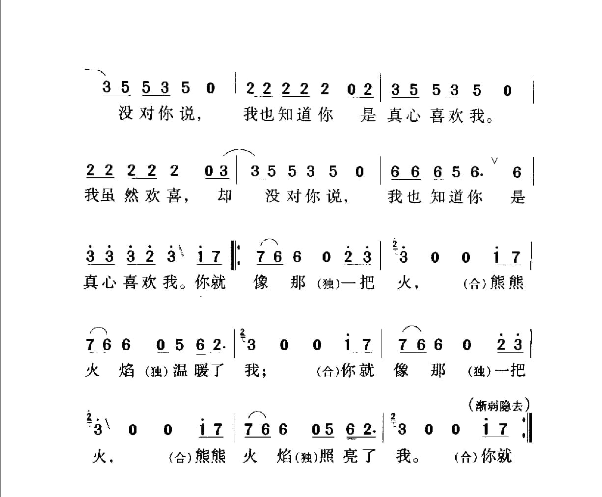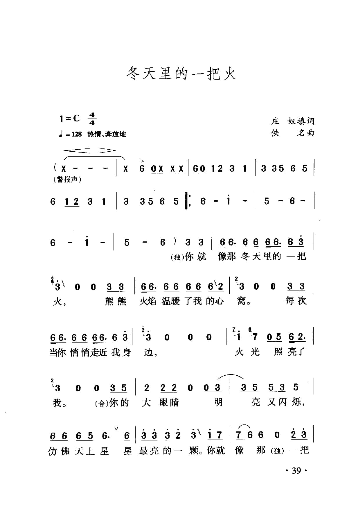 名称:中国名歌500首乐谱:冬天里的一把火 庄奴填词 佚名曲国家:中国分类:曲谱子类:歌谱乐谱类型:简谱/五线谱专辑系列:中国名歌500首乐谱文件格式:jpg中国名歌500首乐谱:冬天里的一把火 庄奴填词 佚名曲