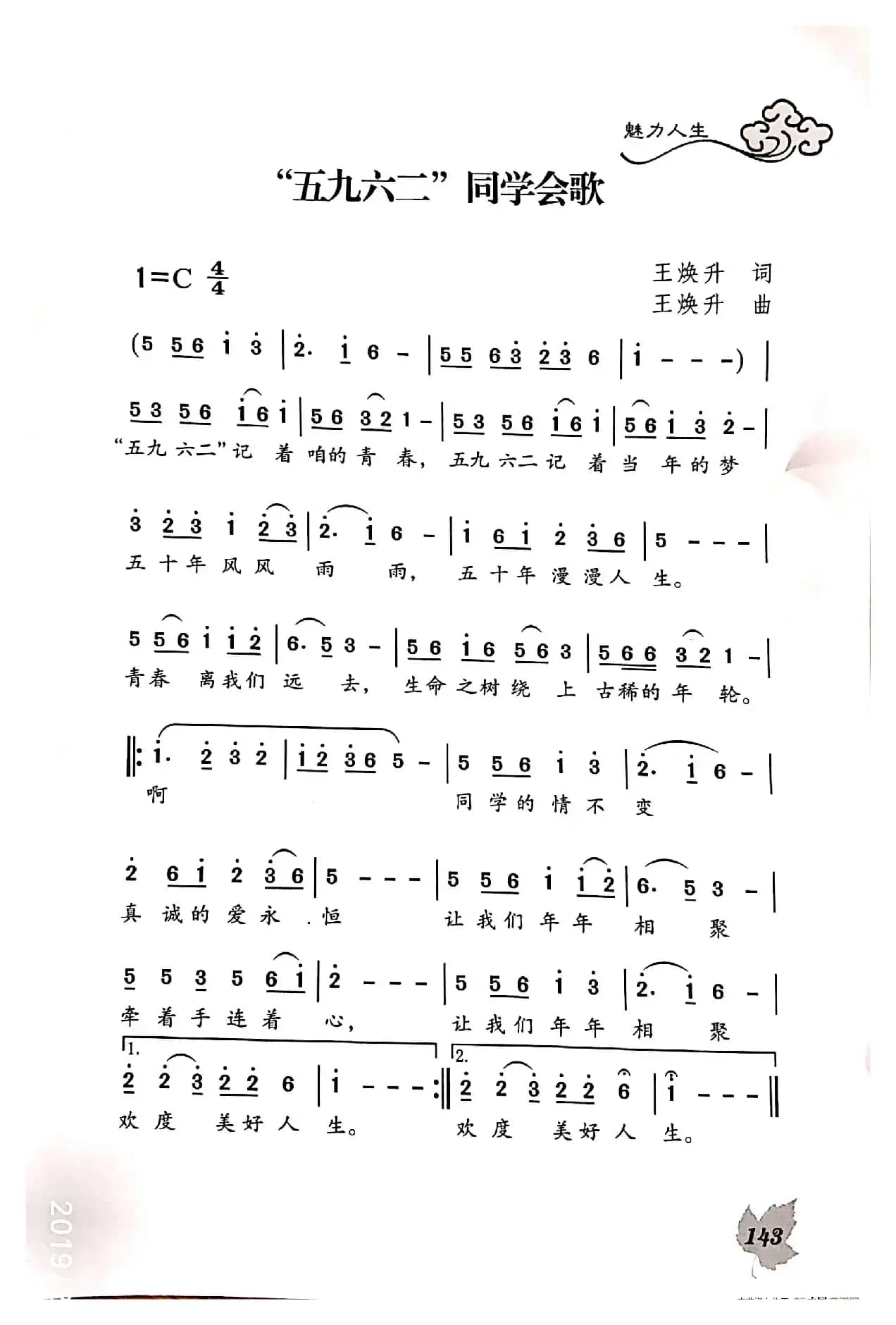 名称:"五九六二"同学会歌国家:中国作词:王焕升作曲:王焕升分类:曲谱子类:歌谱乐谱类型:简谱文件格式:jpg