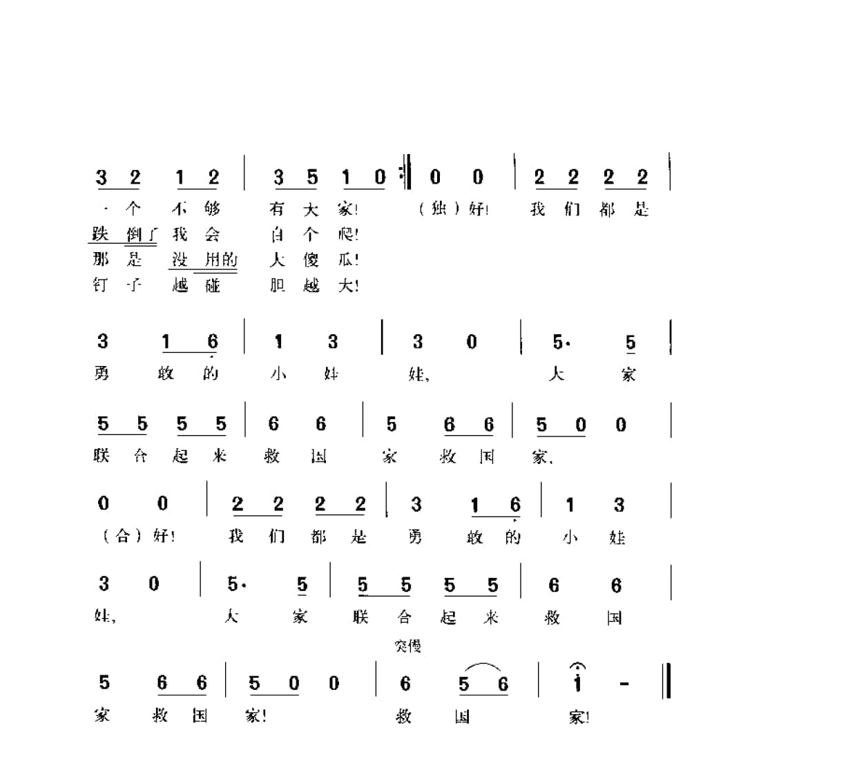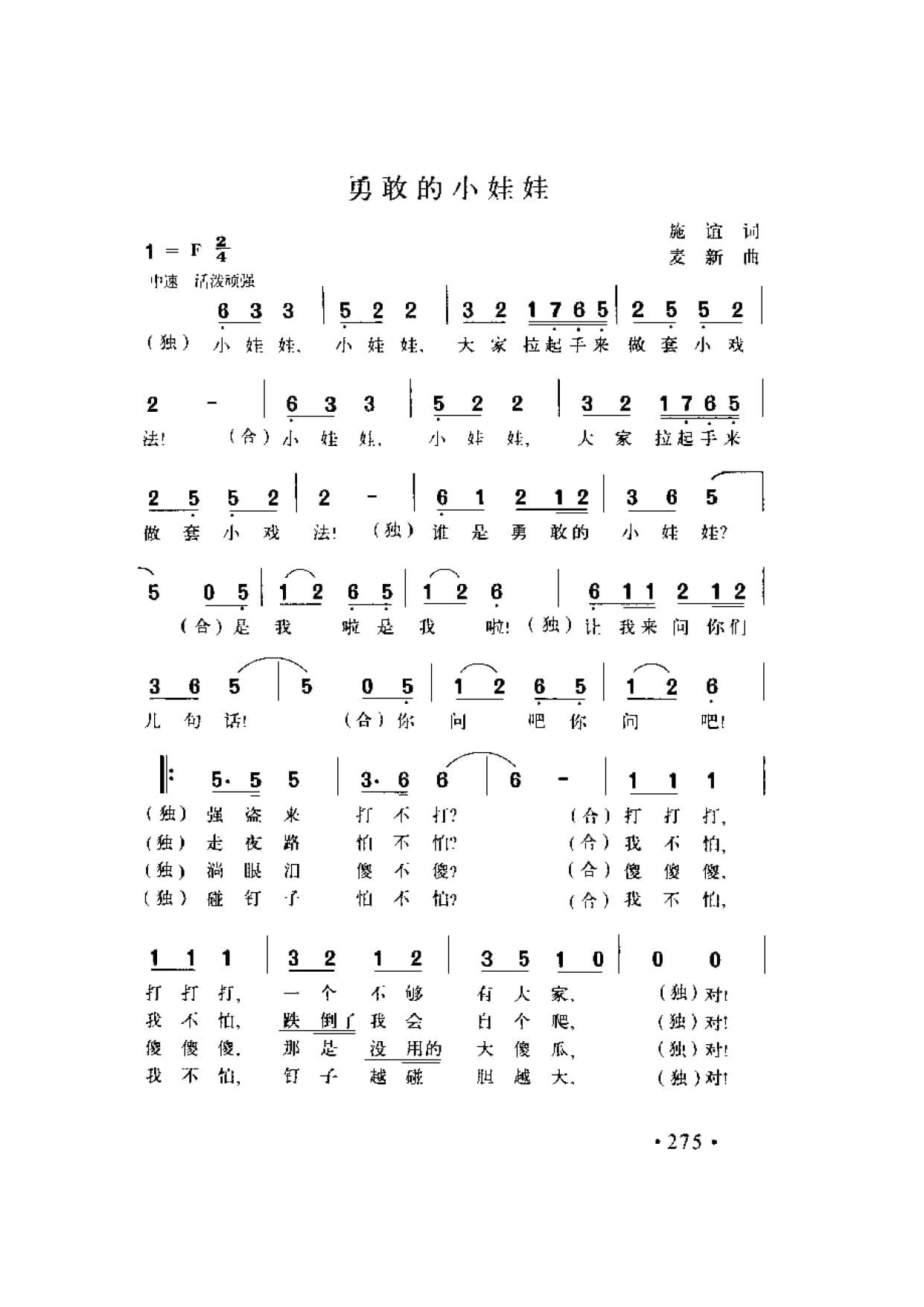 名称:勇敢的小娃娃 施谊词 麦新曲国家:中国分类:曲谱子类:歌谱乐谱类型:简谱/五线谱文件格式:jpg
