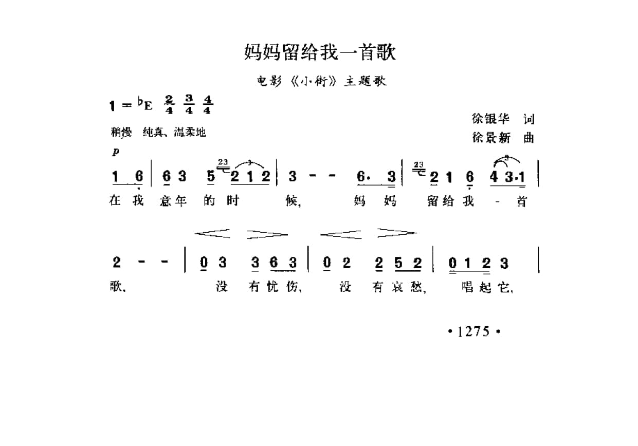 名称:妈妈留给我一首歌 电影 小街 主题歌 徐银华词 徐景薪曲