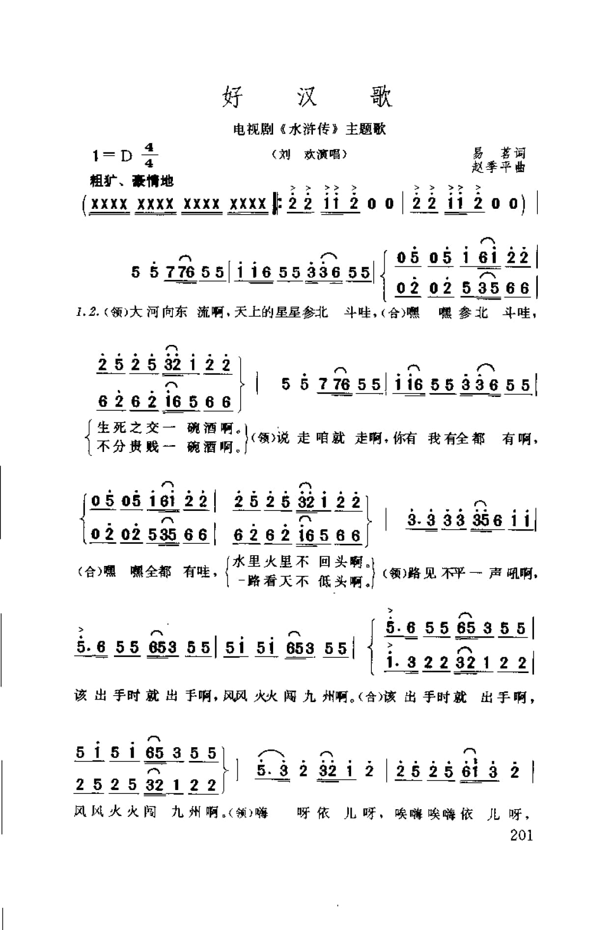 名称:简谱:好汉歌 电视剧 水浒传 主题歌 1998易茗词 赵季平曲 刘欢演唱国家:中国分类:曲谱子类:歌谱乐谱类型:简谱文件格式:jpg简谱:好汉歌 电视剧《水浒传》主题歌·1998易茗词 赵季平曲(刘欢演唱)