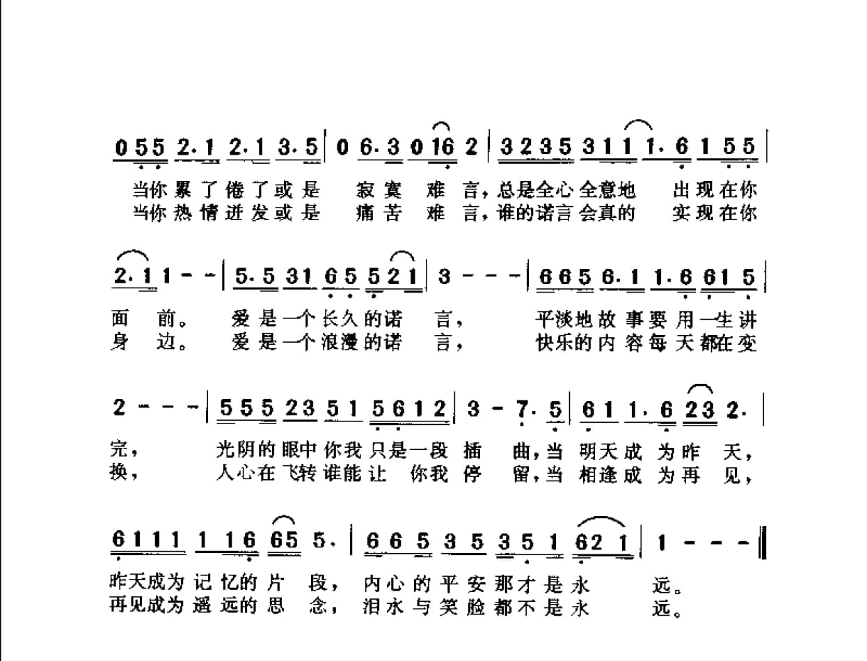 名称:爱是一个长久的诺言 电视剧 我爱我家 片尾曲 1999陈涛 徐安利词 关峡曲 毛阿敏 章鹏演唱国家:中国分类:曲谱子类:歌谱乐谱类型:简谱/五线谱文件格式:jpg爱是一个长久的诺言 电视剧《我爱我家》片尾曲·1999陈涛、徐安利词 关峡曲(毛阿敏、章鹏演唱)