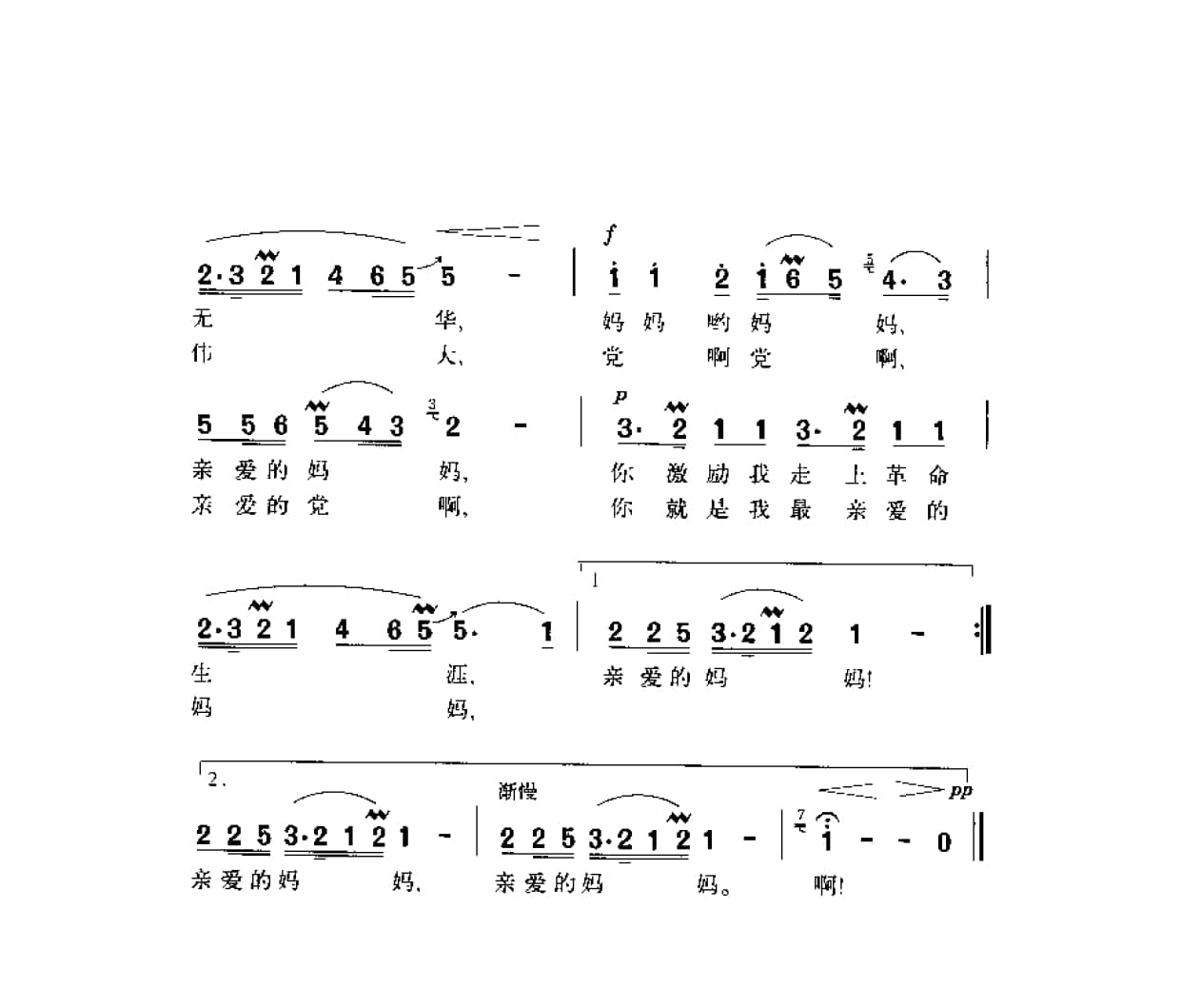 名称:党啊,亲爱的妈妈 龚爱书 余致迪词 马殿银 周右曲国家:中国分类:曲谱子类:歌谱乐谱类型:简谱/五线谱文件格式:jpg