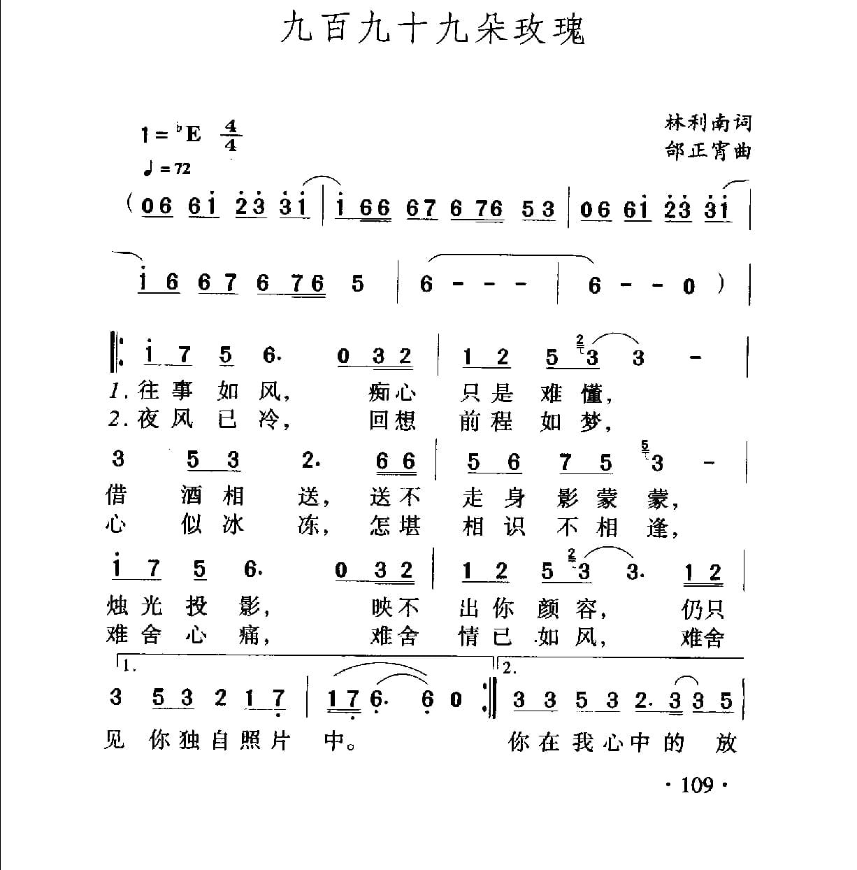 名称:九百九十九朵玫瑰 林利南词 邻正曲国家:中国分类:曲谱子类:歌谱乐谱类型:简谱/五线谱文件格式:jpg