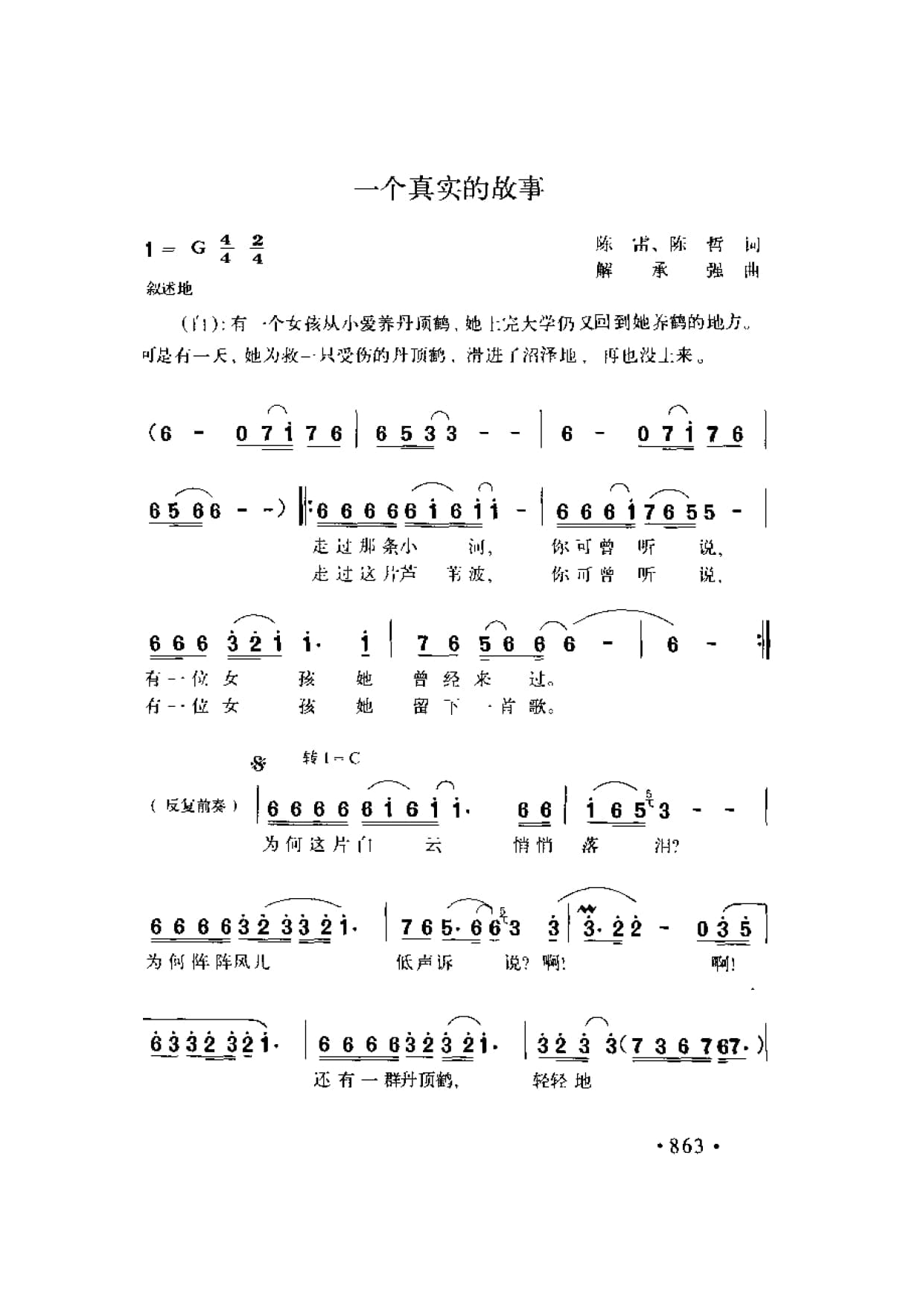 名称:一个真实的故事 陈雷 陈哲词 解承强曲国家:中国分类:曲谱子类:歌谱乐谱类型:简谱/五线谱文件格式:jpg