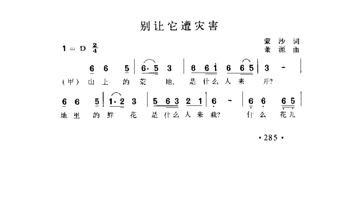 名称:别让它遭灾害 蒙沙词 董源曲国家:中国分类:曲谱子类:歌谱乐谱类型:简谱/五线谱文件格式:jpg