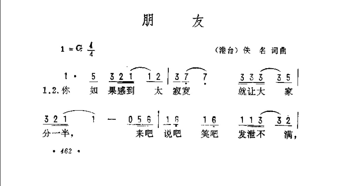 名称:朋友 港台 佚名词曲国家:中国分类:曲谱子类:歌谱乐谱类型:简谱/五线谱文件格式:jpg