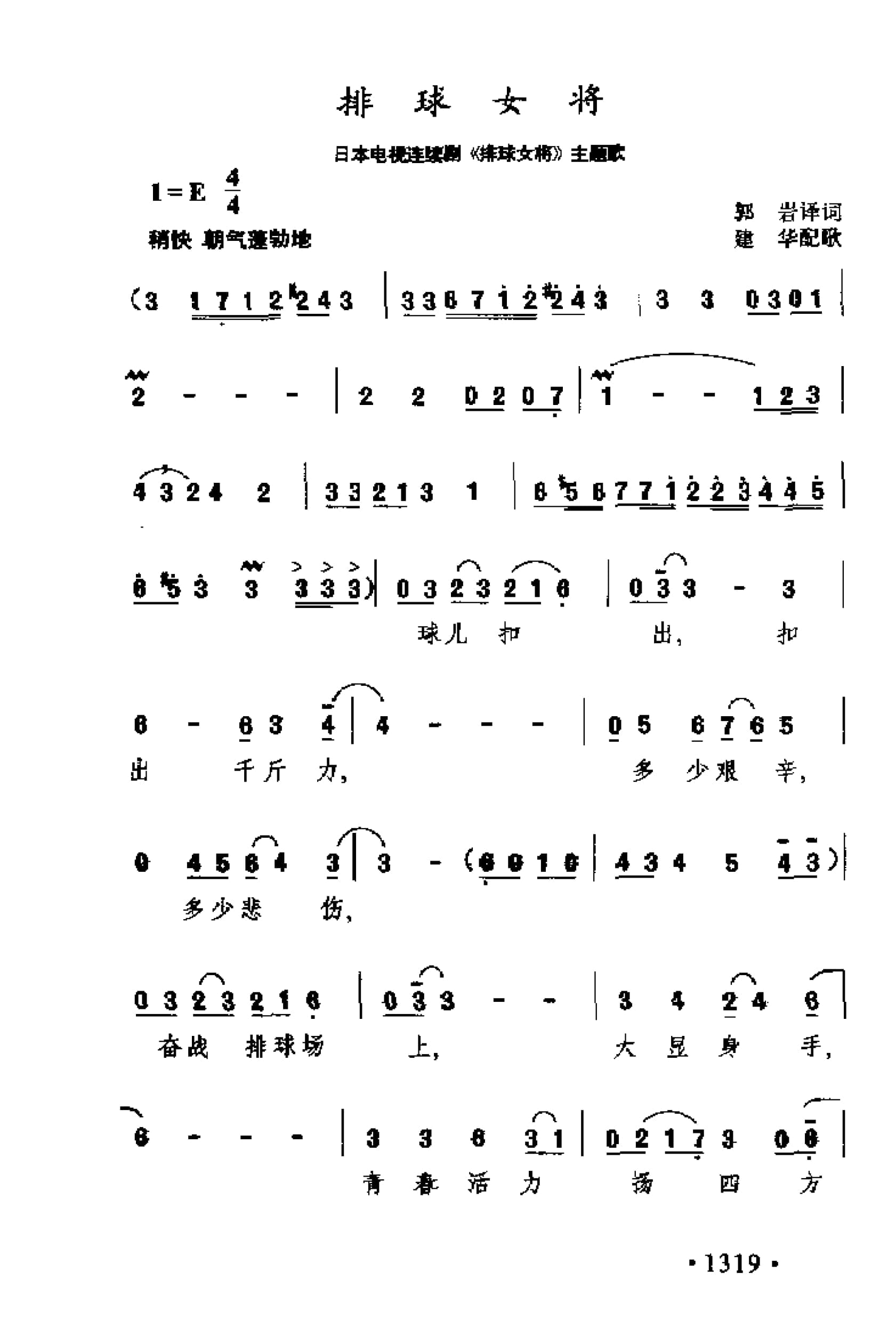 名称:排球女将 日本电视连续剧 排球女将 主题歌国家:日本分类:曲谱子类:歌谱乐谱类型:简谱/五线谱文件格式:jpg