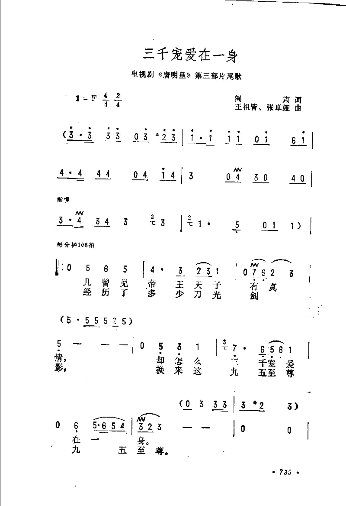 名称:三千宠爱在一身 电视剧 唐明皇 第三部片尾歌 阎肃词 王祖皆 张卓娅曲国家:中国分类:曲谱子类:歌谱乐谱类型:简谱/五线谱文件格式:jpg三千宠爱在一身(电视剧《唐明皇》第三部片尾歌)阎肃词 王祖皆、张卓娅曲