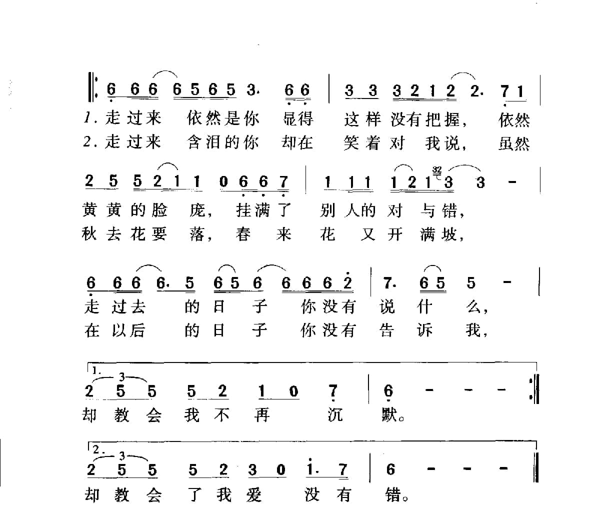 名称:走过来依然是你 电视剧 花落花开 片尾歇 李海鹰词曲国家:中国分类:曲谱子类:歌谱乐谱类型:简谱/五线谱文件格式:jpg