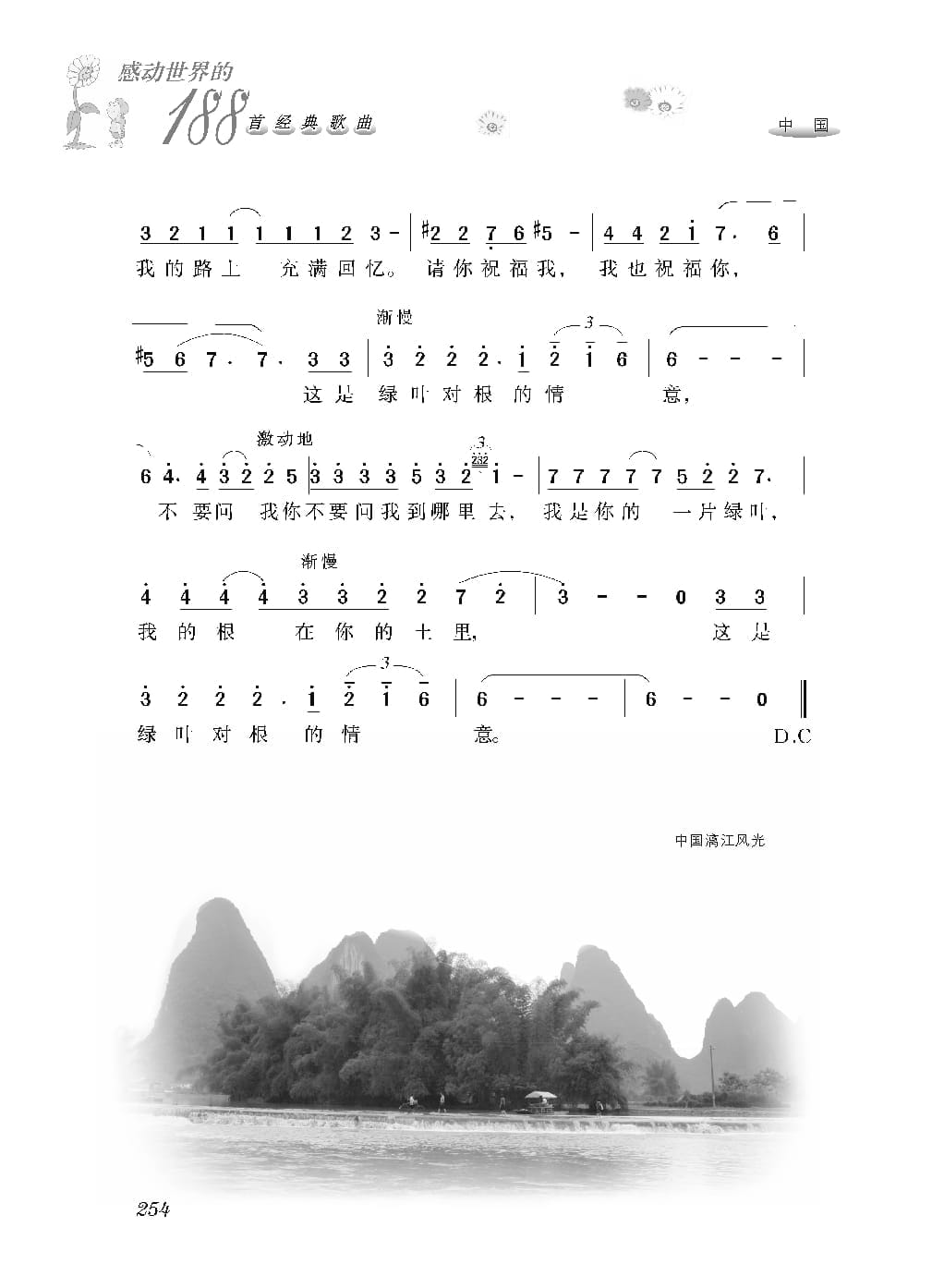 名称:中国经典歌曲谱:绿叶对根的情意 简谱