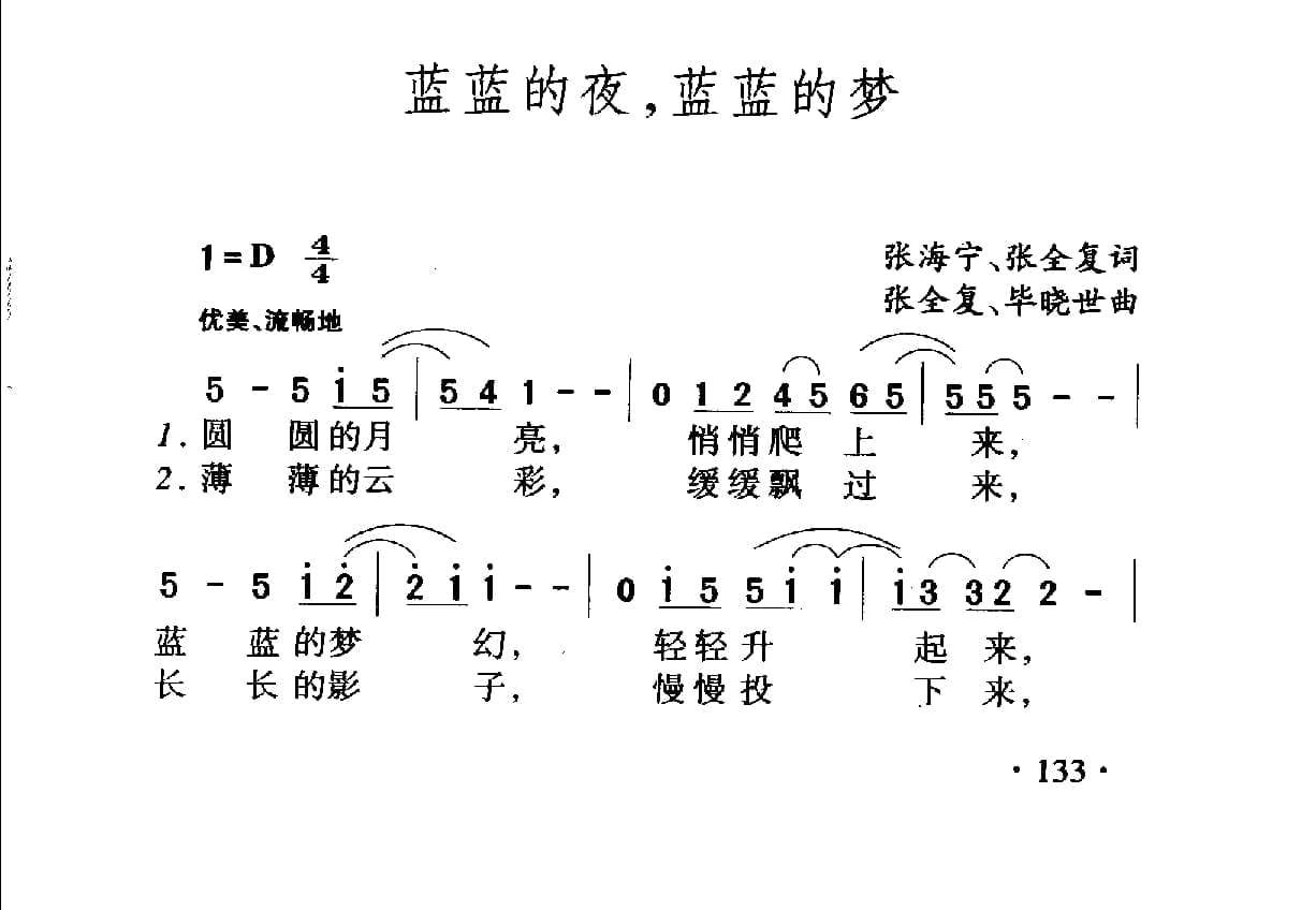 名称:蓝蓝的夜,蓝蓝的梦 张海宁 张全复词张全复 毕晓世典国家:中国分类:曲谱子类:歌谱乐谱类型:简谱/五线谱文件格式:jpg