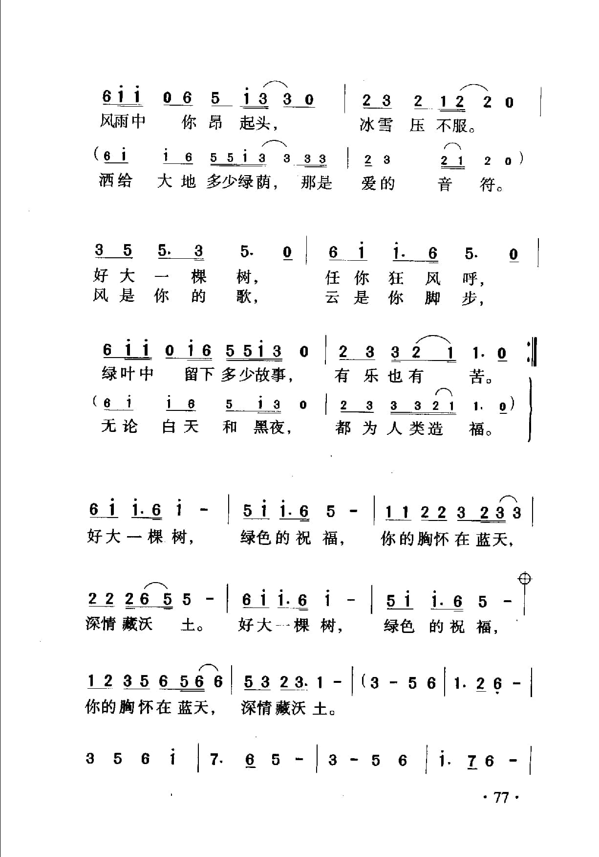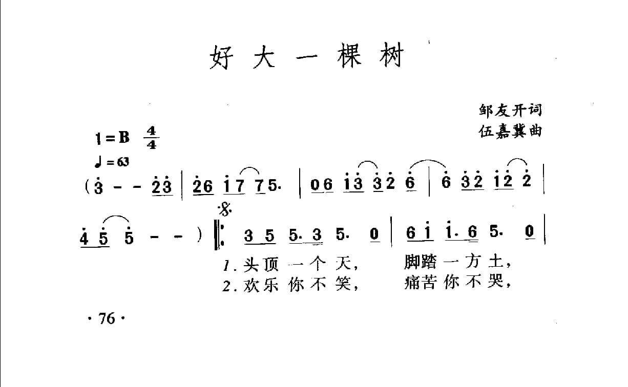 名称:中国名歌500首乐谱:好大一棵树 邹友开词 伍嘉翼曲国家:中国分类:曲谱子类:歌谱乐谱类型:简谱/五线谱专辑系列:中国名歌500首乐谱文件格式:jpg中国名歌500首乐谱:好大一棵树 邹友开词 伍嘉翼曲