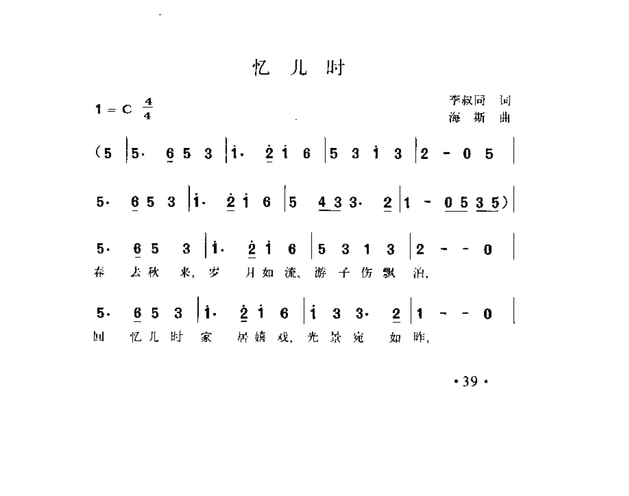名称:忆儿时 李叔同词 海斯曲