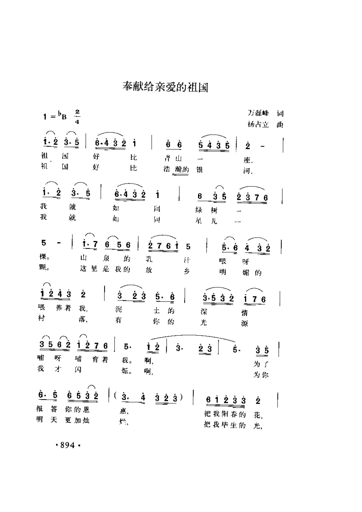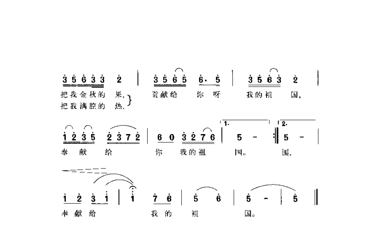 名称:奉献给亲爱的祖国 万磊峰词 杨占立曲国家:中国分类:曲谱子类:歌谱乐谱类型:简谱/五线谱文件格式:jpg