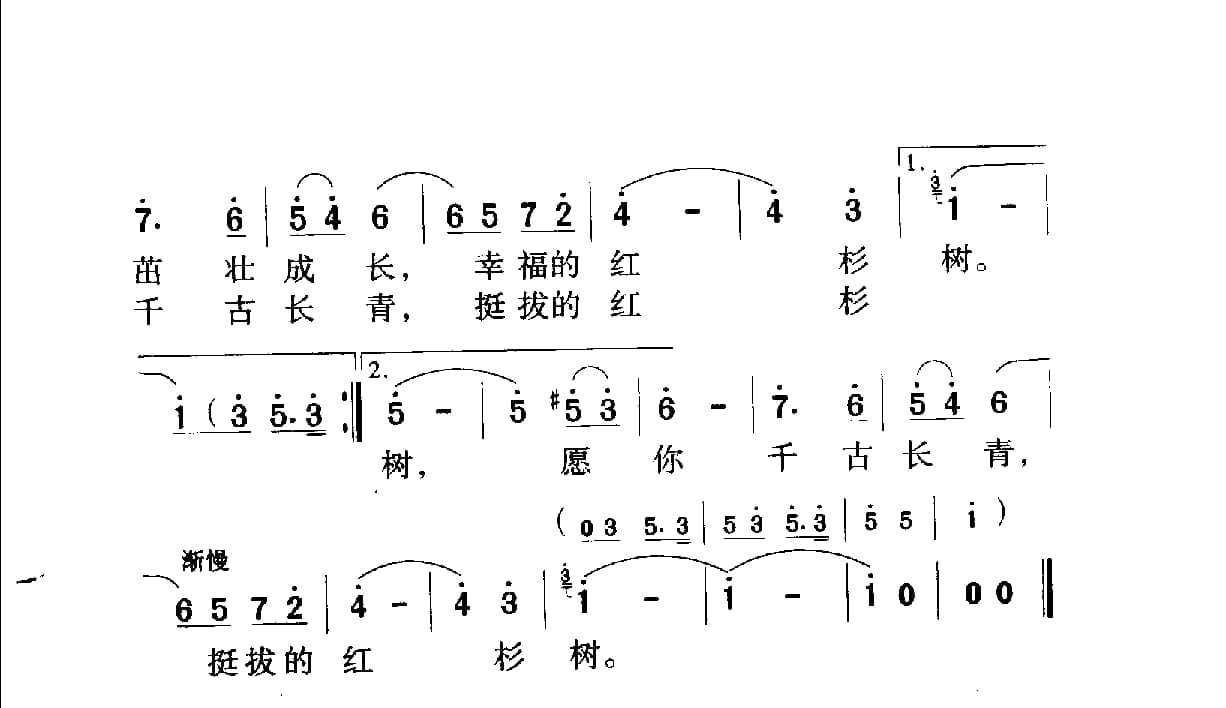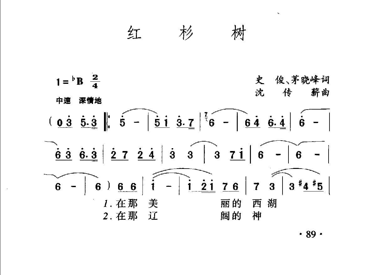 名称:中国名歌500首乐谱:红杉树 史俊 茅晓峰词 沈传薪曲国家:中国分类:曲谱子类:歌谱乐谱类型:简谱/五线谱专辑系列:中国名歌500首乐谱文件格式:jpg中国名歌500首乐谱:红杉树 史俊、茅晓峰词 沈传薪曲