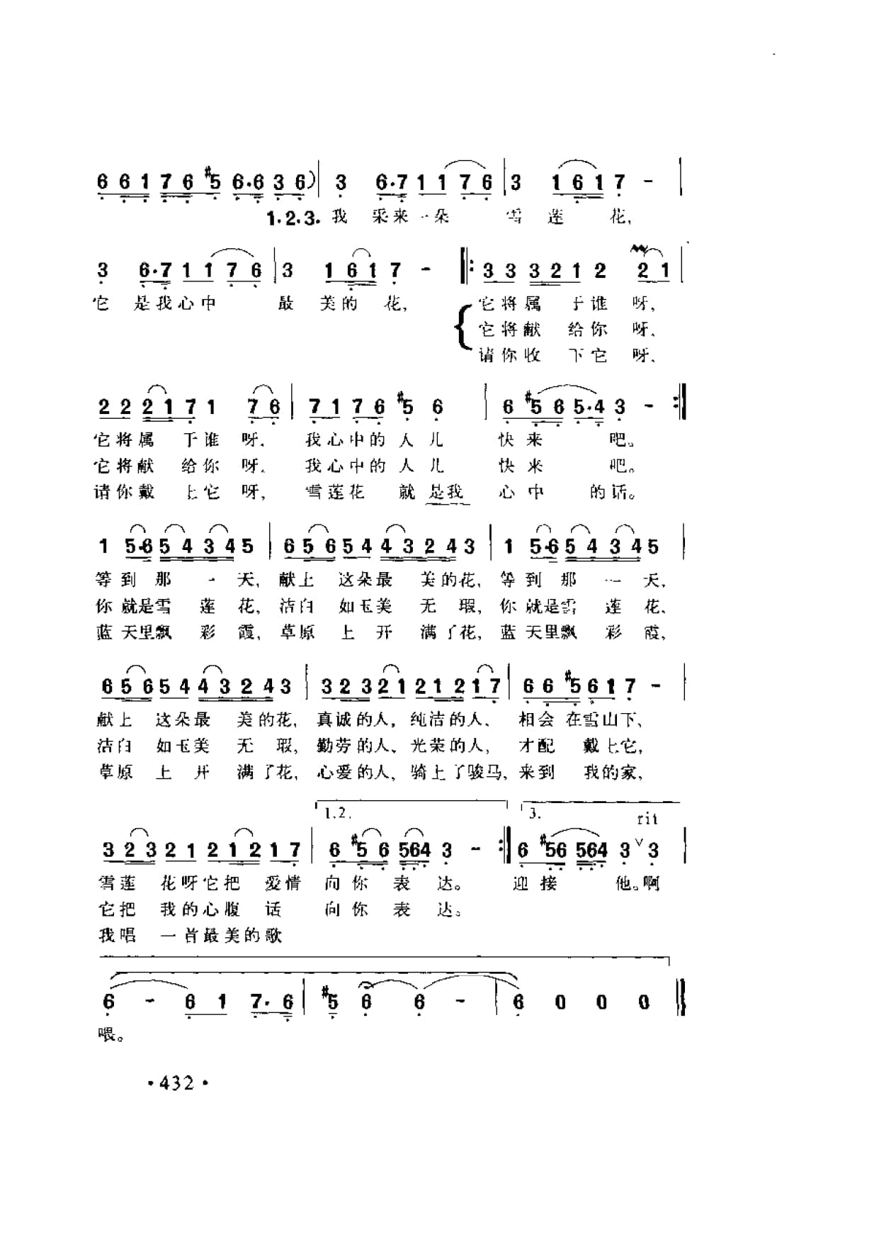 名称:雪莲花 缪也 丁朗 程凯词 石夫曲国家:中国分类:曲谱子类:歌谱乐谱类型:简谱/五线谱文件格式:jpg