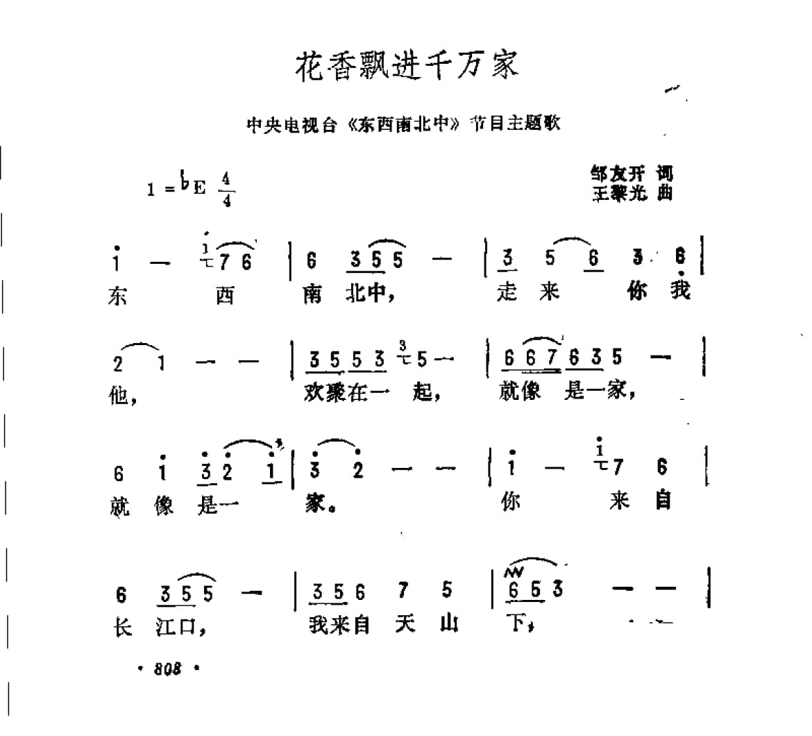 名称:花香飘进千万家 中央电视台 东西南北中 节目主题歌 邹友开词 王黎光曲国家:中国分类:曲谱子类:歌谱乐谱类型:简谱/五线谱文件格式:jpg花香飘进千万家(中央电视台《东西南北中》节目主题歌)邹友开词 王黎光曲
