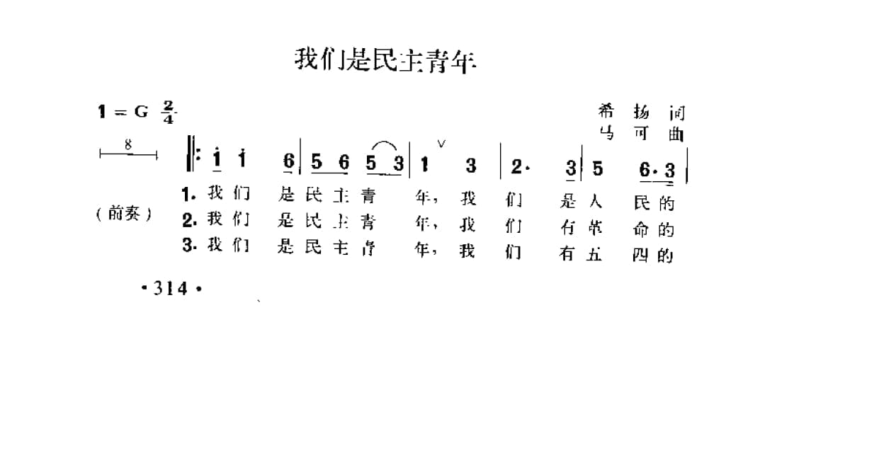名称:我们是民主青年 希扬词 马可曲国家:中国分类:曲谱子类:歌谱乐谱类型:简谱/五线谱文件格式:jpg