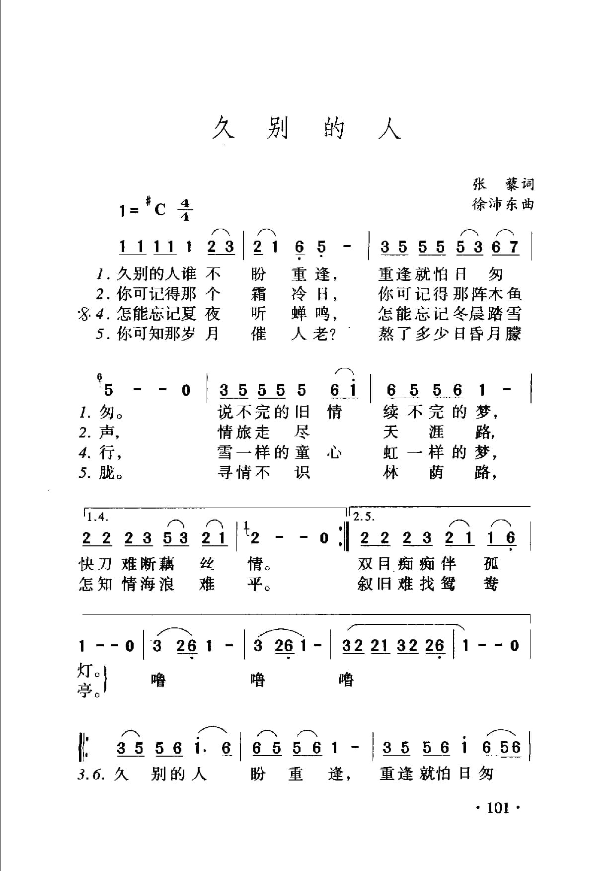 名称:久别的人 张藜词 徐沛东曲国家:中国分类:曲谱子类:歌谱乐谱类型:简谱/五线谱文件格式:jpg
