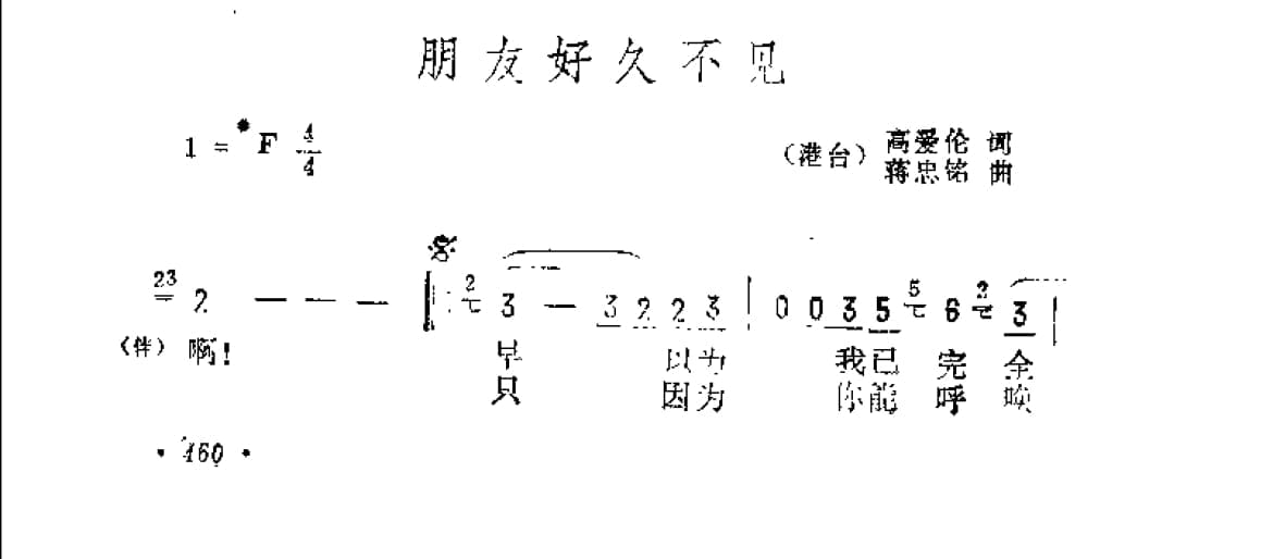 名称:朋友好久不见 港台 高爱伦词 蒋忠铭曲国家:中国分类:曲谱子类:歌谱乐谱类型:简谱/五线谱文件格式:jpg