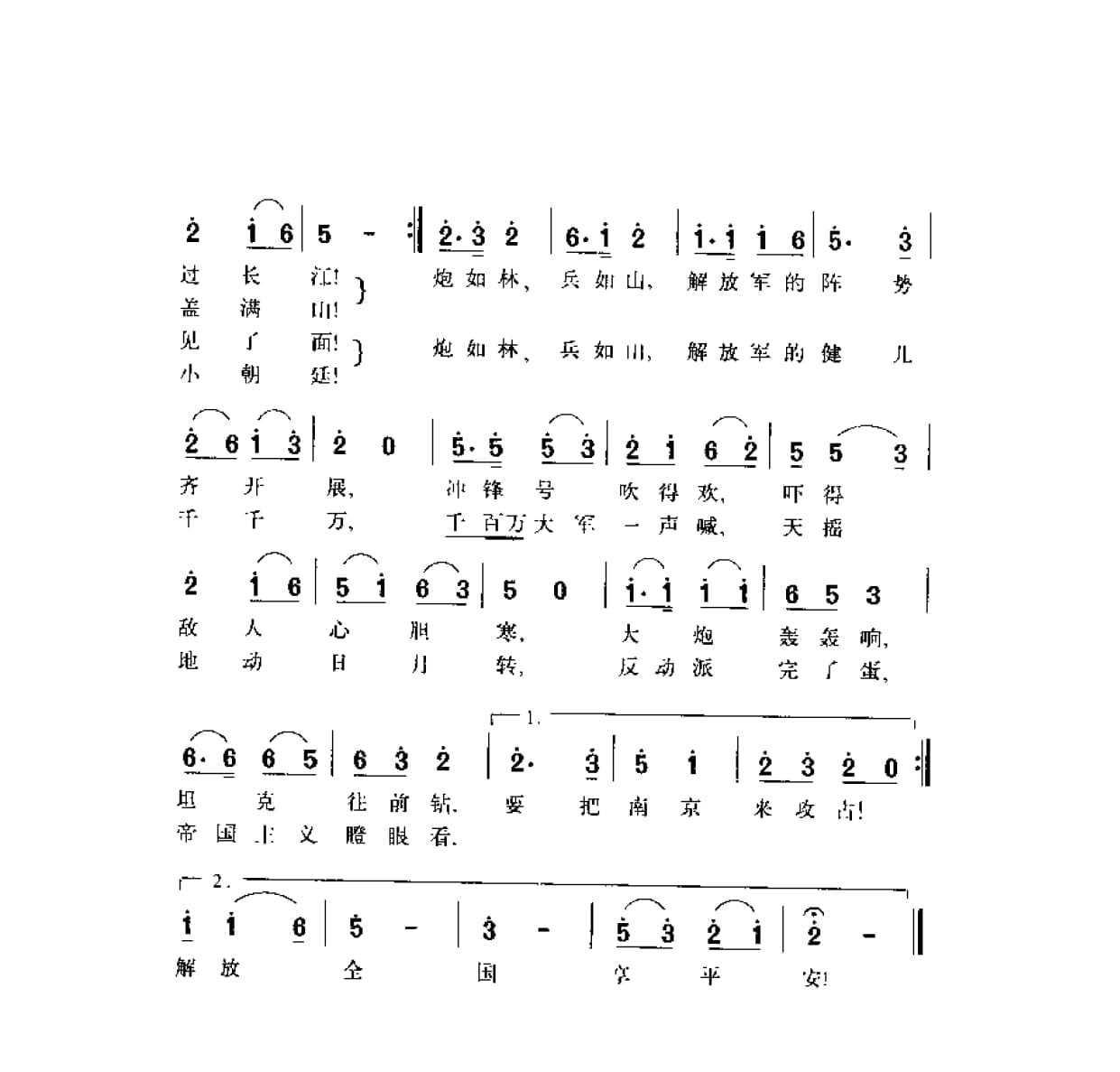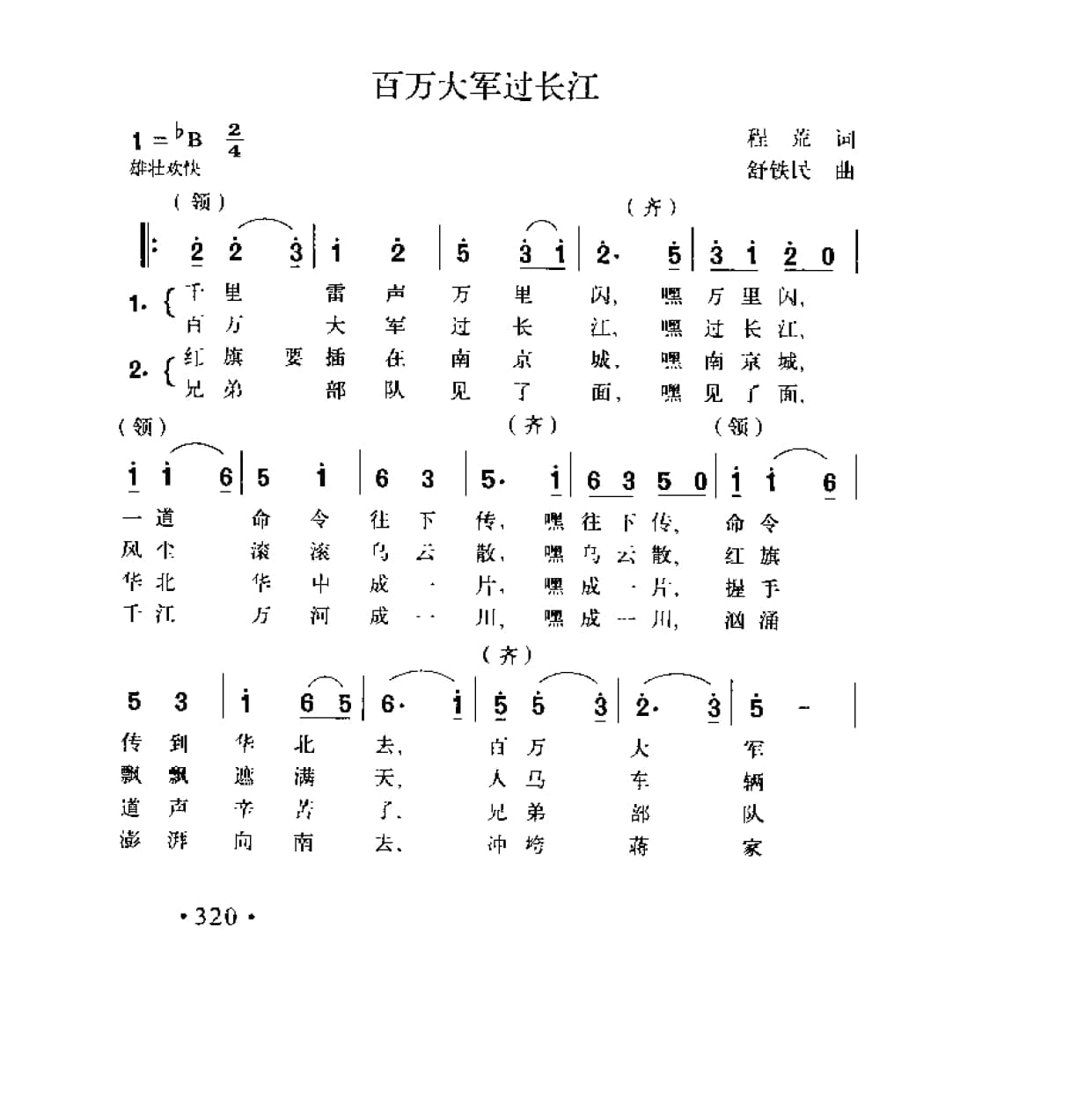 名称:百万大军过长江 程荒词 舒铁民曲国家:中国分类:曲谱子类:歌谱乐谱类型:简谱/五线谱文件格式:jpg