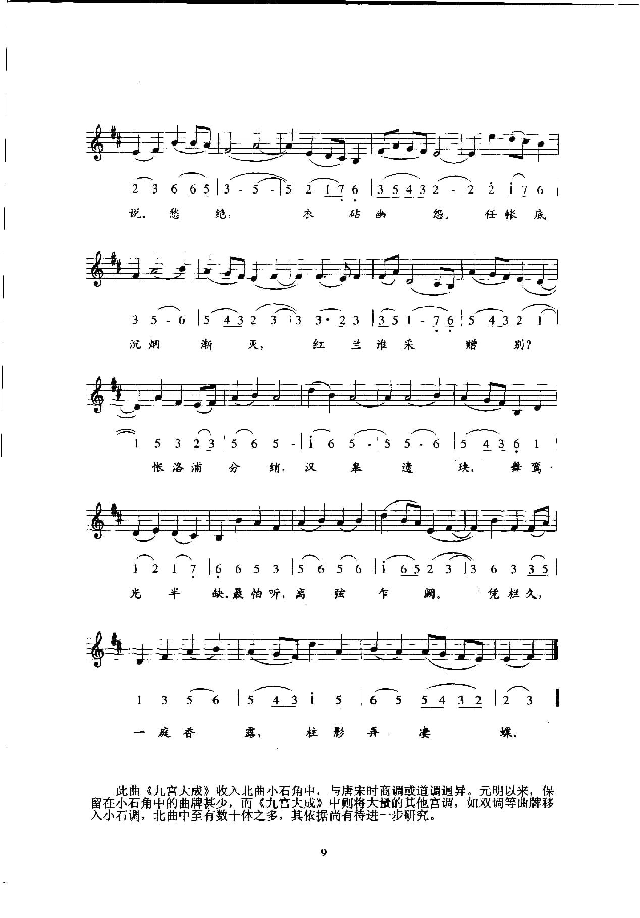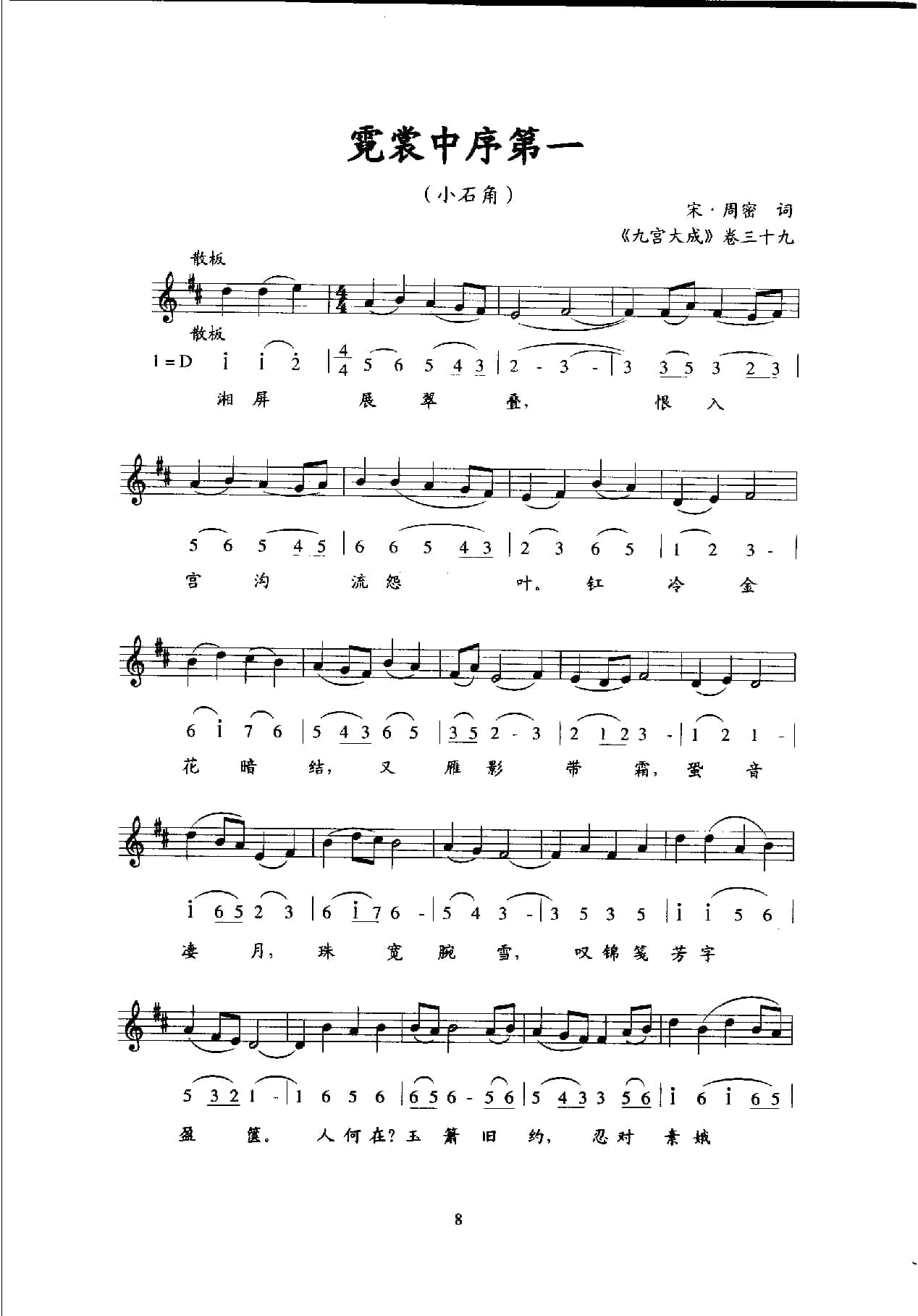 名称:唐宋词古乐谱:霓裳中序第一 宋 周密 五线谱国家:中国分类:曲谱子类:歌谱乐谱类型:五线谱专辑系列:唐宋词古乐谱文件格式:jpg此曲《九宫大成》收入北曲小石角中,与唐宋时商调或道调迥异。元明以来,保留在小石角中的曲牌甚少,而《九宫大成》中则将大量的其他宫调,如双调等曲牌移入小石调,北曲中至有数十体之多,其依据尚有待进一步研究。