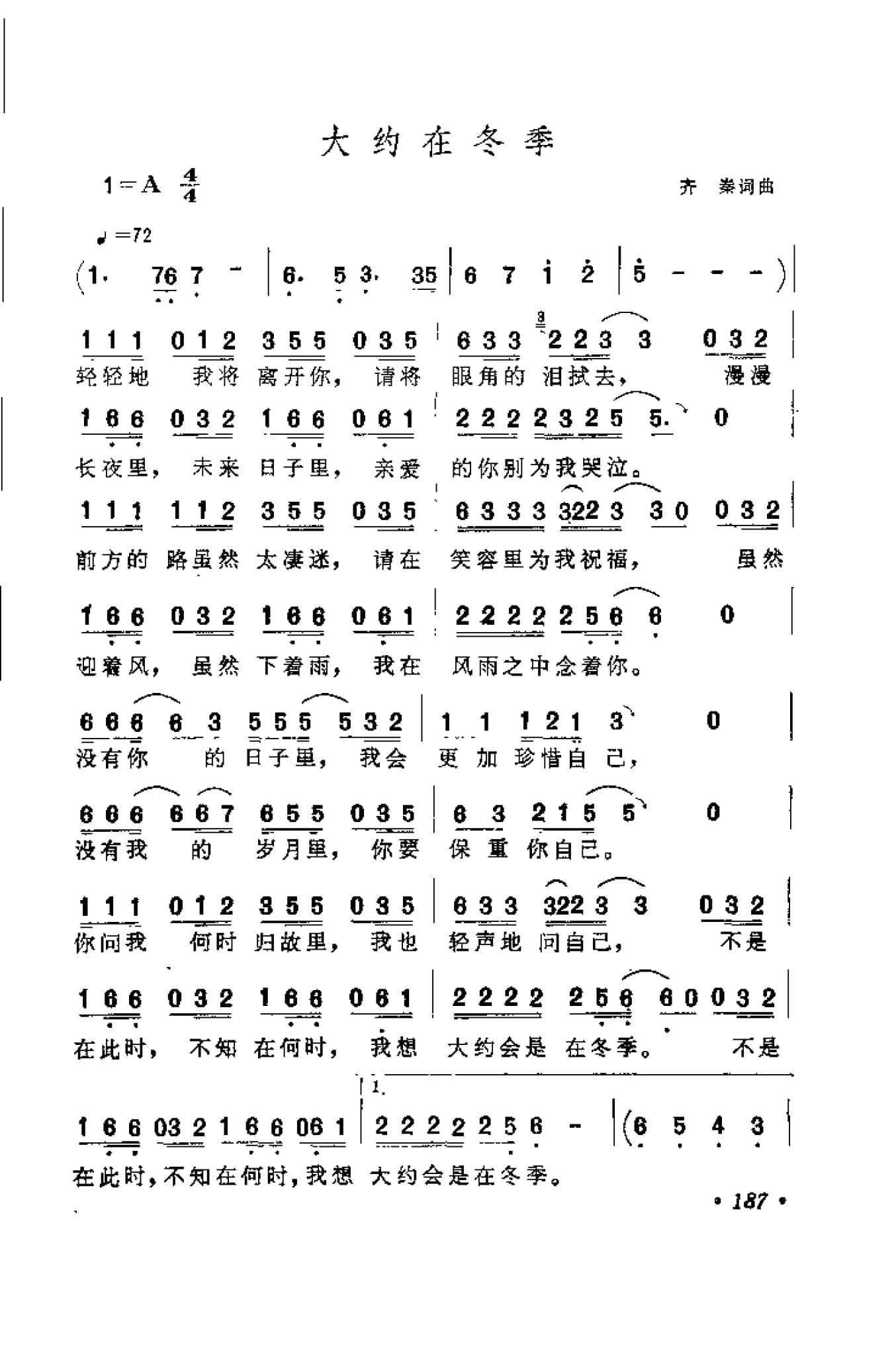 名称:齐秦歌曲谱:大约在冬季