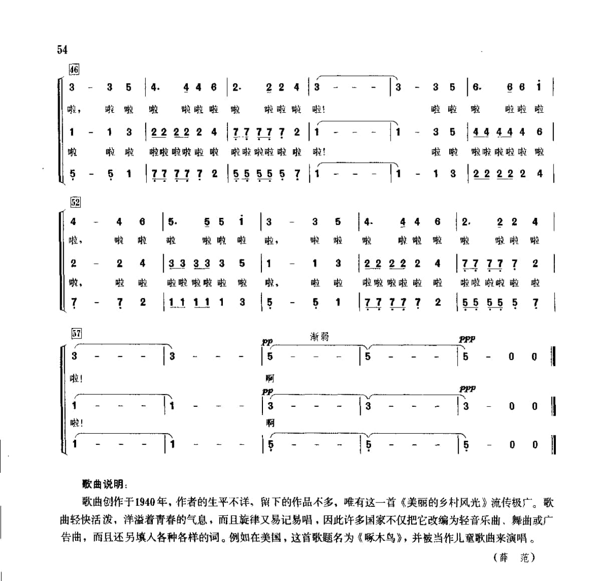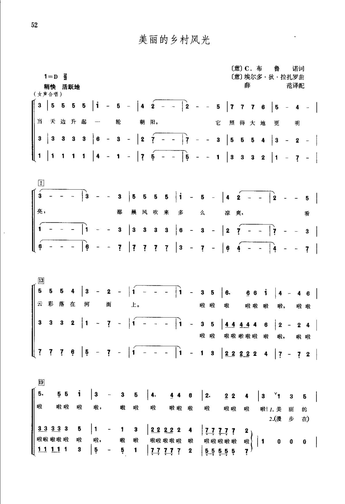名称:美丽的乡村风光 意 C.布鲁诺词 意 埃尔多 狄 拉扎罗曲国家:中国分类:歌谱子类:合唱歌谱类型:简谱/五线谱文件格式:jpg歌曲说明:歌曲创作于1940年,作者的生平不详,留下的作品不多,唯有这一首《美丽的乡村风光》流传极广。歌曲轻快活泼,洋溢着青春的气息,而且旋律又易记易唱,因此许多国家不仅把它改编为轻音乐曲、舞曲或广告曲,而且还另填人各种各样的词。例如在美国,这首歌题名为《啄木鸟》,并被当作儿童歌曲来演唱。