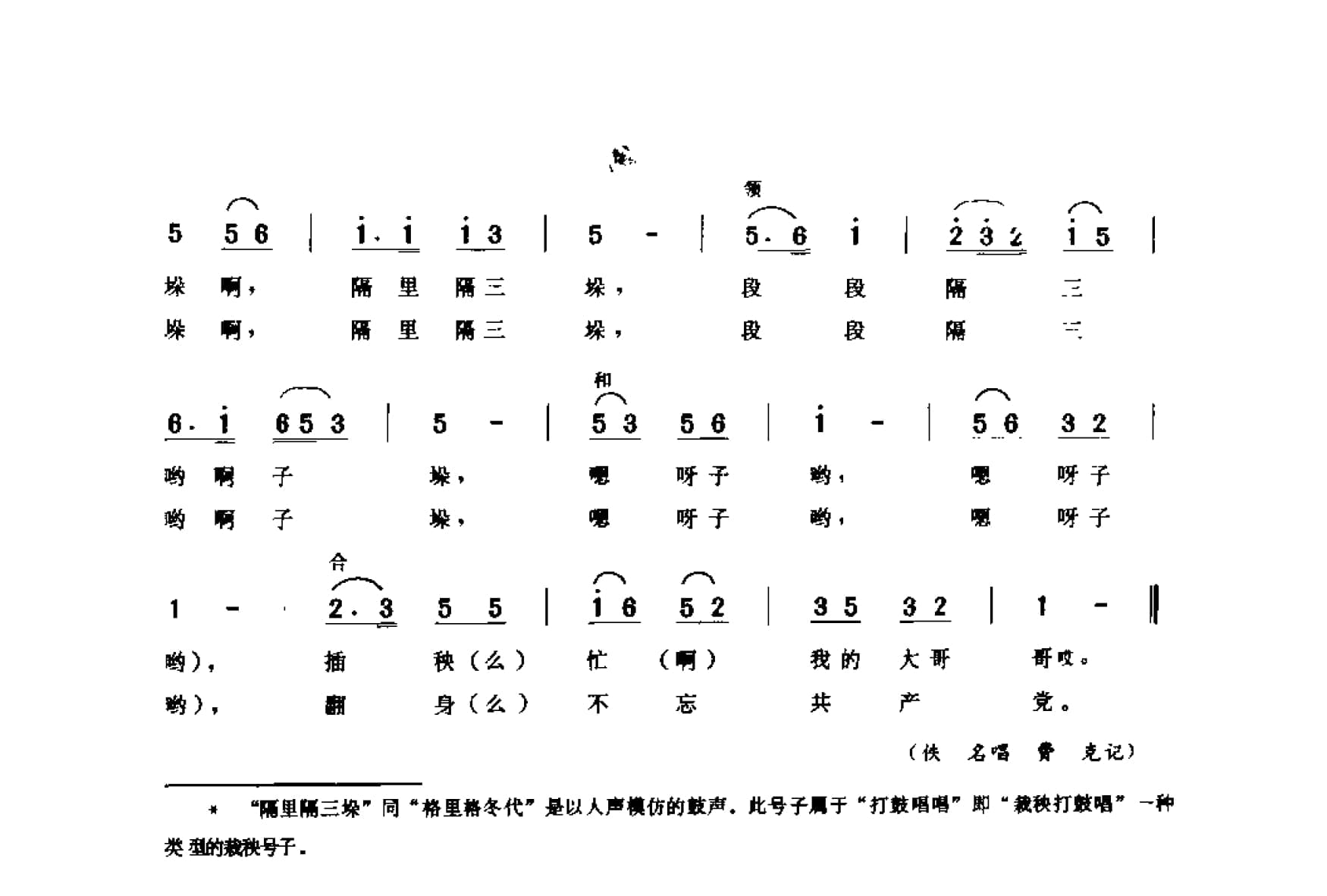 名称:布谷鸟声声叫得响 栽秧号子 隔里隔三垛 兴化市国家:中国分类:歌谱子类:民歌谱类型:简谱/五线谱文件格式:jpg