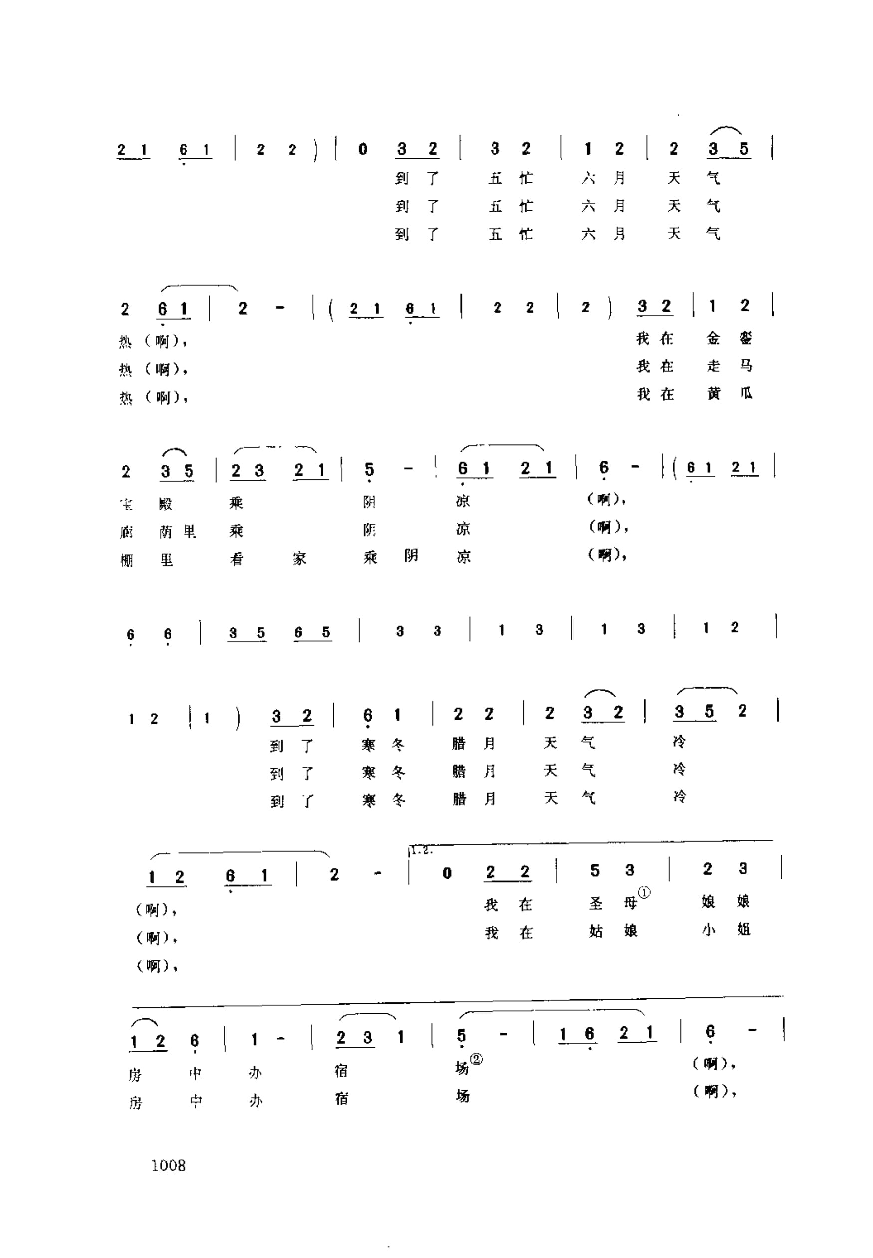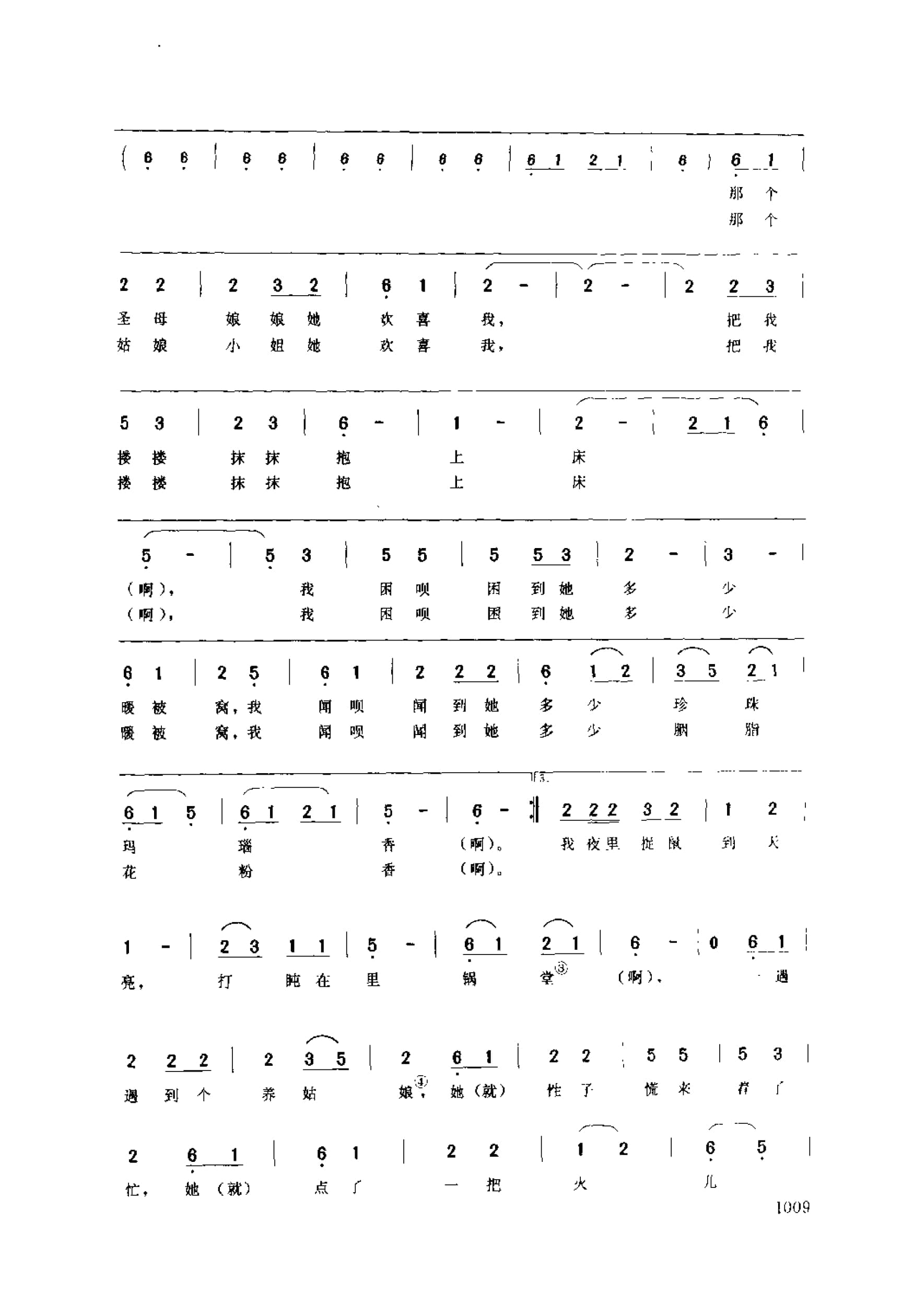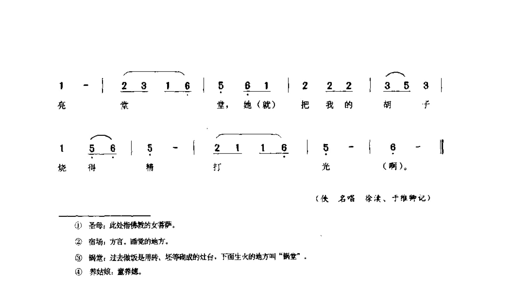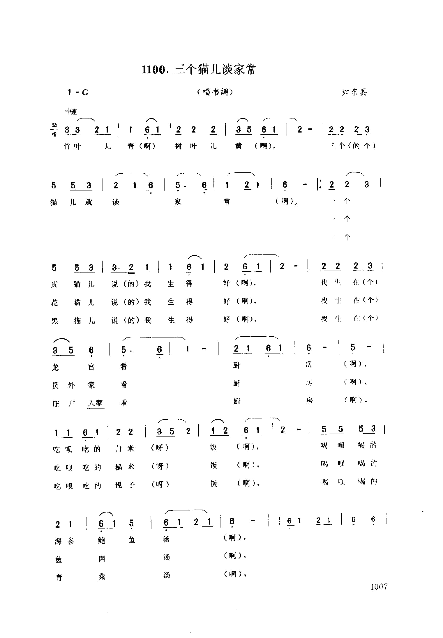 名称:三个猫儿淡家常 唱书调 如东县国家:中国分类:歌谱子类:民歌谱类型:简谱/五线谱文件格式:jpg三个猫儿淡家常(唱书调) 如东县圣母:此处指佛教的女菩萨,② 宿场:方言。睡觉的地方。锅堂:过去微饭是用砖、还等现成的灶台,下面生火的地方叫“锅堂”莽姑娘:童养娘。