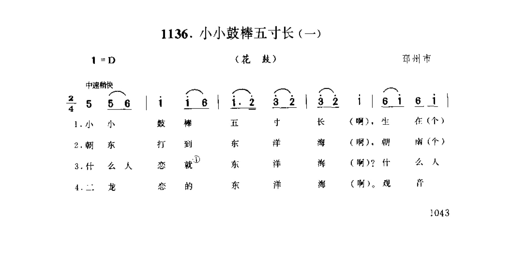 名称:歌舞小调_小小鼓棒五寸长 一 花鼓 邳州市国家:中国分类:歌谱子类:民歌谱类型:简谱/五线谱文件格式:jpg