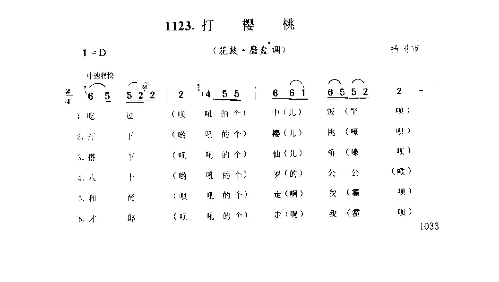歌舞小调:打樱桃(花鼓·磨盘调) 扬州市简谱歌词是曲谱查询网于2024年12月25日 11:04:25更新在民歌曲谱频道中的内容,收录在民歌曲谱栏目中;曲谱查询网分享的歌舞小调:打樱桃(花鼓·磨盘调) 扬州市简谱五线谱高清图片,欢迎在线免费下载;曲谱查询网无需注册,即可直接下载海量歌曲谱与乐器学习相关资料。