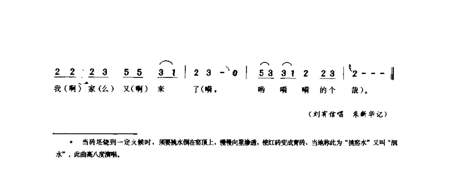 名称:劳动号子_挑窑水号子 东台市国家:中国分类:歌谱子类:民歌谱类型:简谱/五线谱文件格式:jpg当砖坯烧到一定火候时,须要铣水倒在窑顶上,慢慢向里澹透、使红转变成青砖,当地称此为“挑密水”又叫“洇水”。此曲高八度演唱。