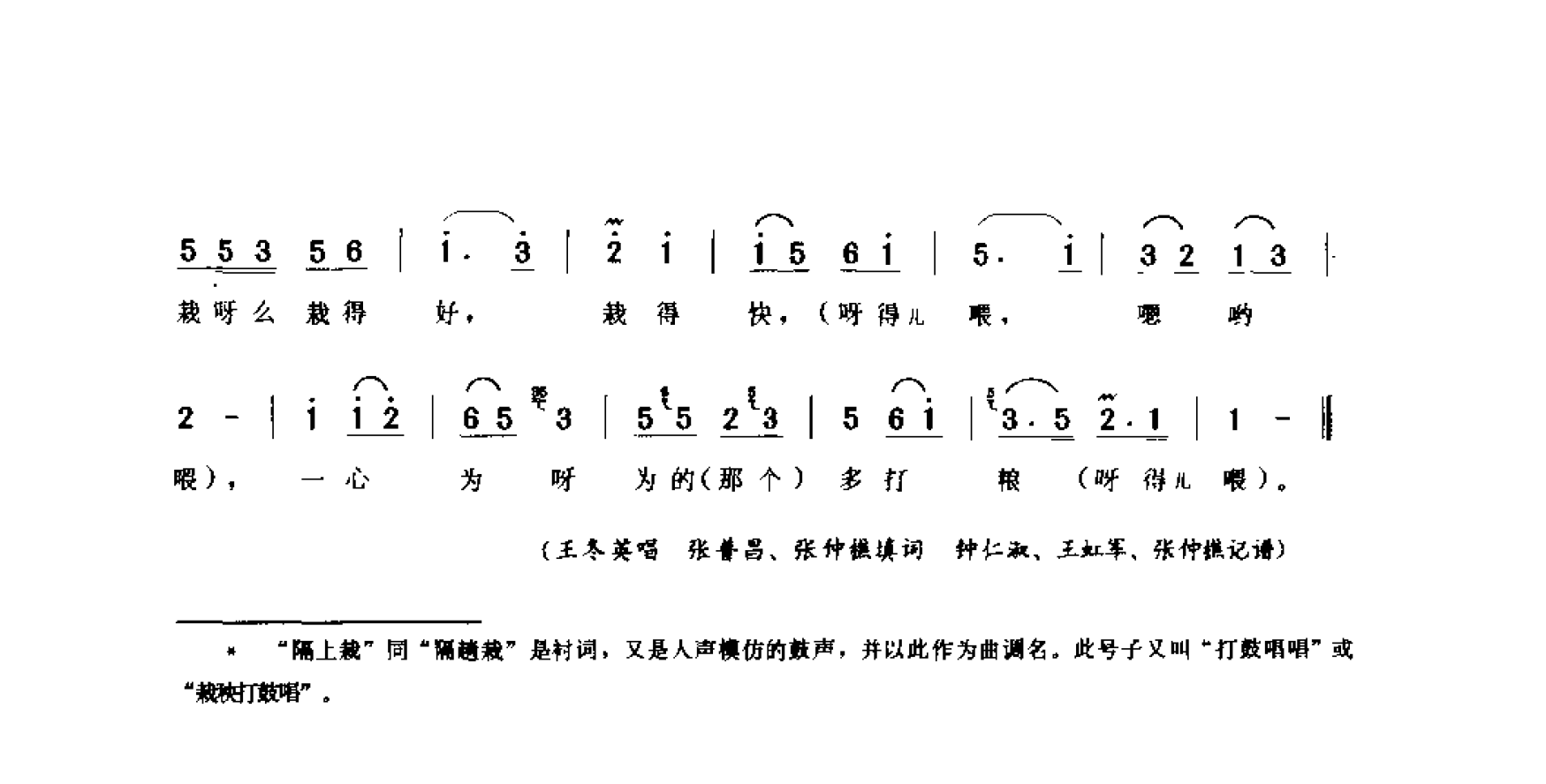 ”隔上裁”同“隔讀栽”是村词,又是人声模仿的鼓声,并以此作为曲调名。此号子又叫“打鼓唱唱”或“栽袂打鼓唱”