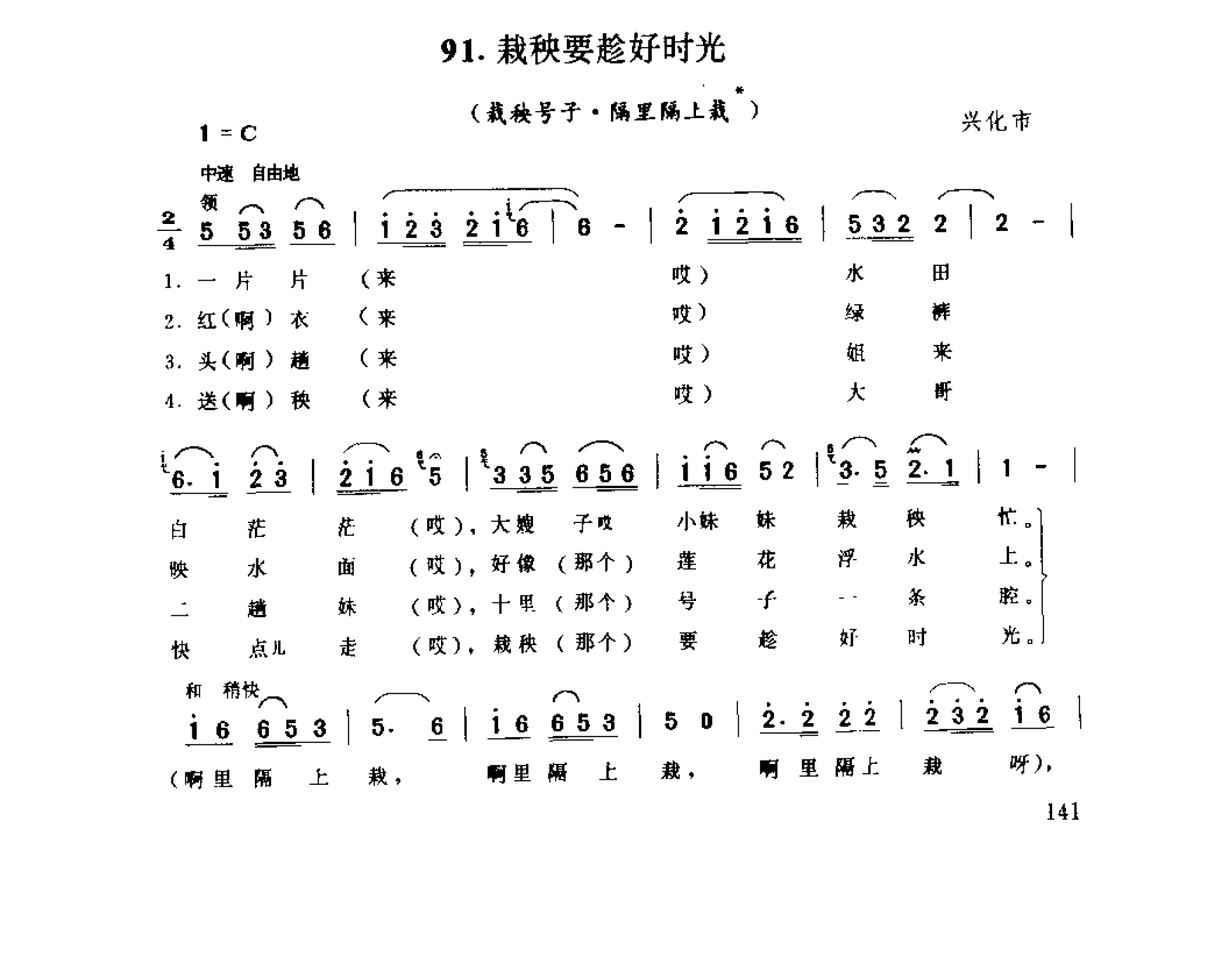 栽秧要趁好时光(栽秧号子·隔里隔上栽) 兴化市简谱歌词是曲谱查询网于2024年12月19日 16:16:25更新在民歌曲谱频道中的内容,收录在民歌曲谱栏目中;曲谱查询网分享的栽秧要趁好时光(栽秧号子·隔里隔上栽) 兴化市简谱五线谱高清图片,欢迎在线免费下载;曲谱查询网无需注册,即可直接下载海量歌曲谱与乐器学习相关资料。