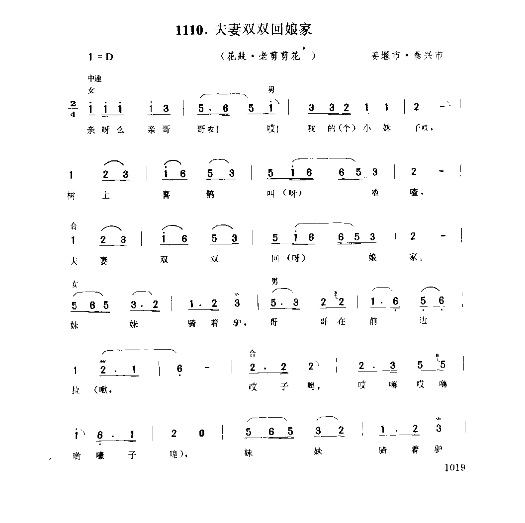 歌舞小调:夫妻双双回娘家(花鼓·老剪剪花) 姜堰市·泰兴市简谱歌词是曲谱查询网于2024年12月25日 10:55:49更新在民歌曲谱频道中的内容,收录在民歌曲谱栏目中;曲谱查询网分享的歌舞小调:夫妻双双回娘家(花鼓·老剪剪花) 姜堰市·泰兴市简谱五线谱高清图片,欢迎在线免费下载;曲谱查询网无需注册,即可直接下载海量歌曲谱与乐器学习相关资料。