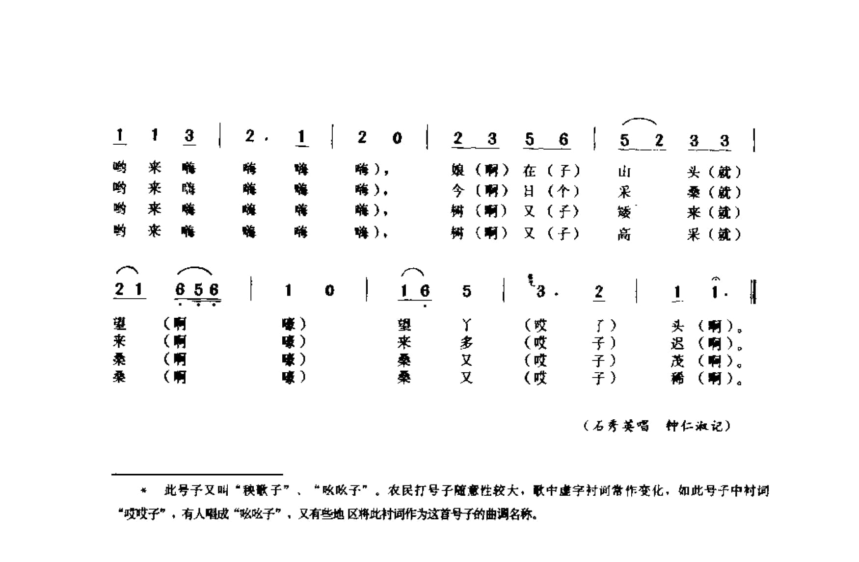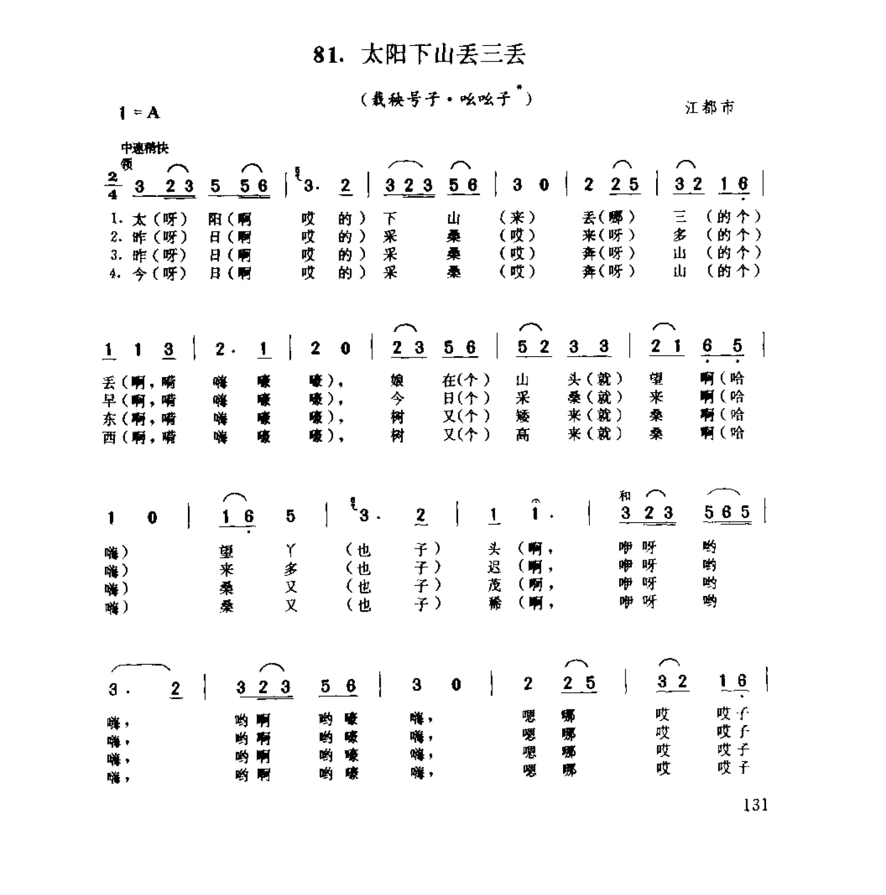 名称:太阳下山丟三丢 栽秧号子 吆吆子 江都市国家:中国分类:歌谱子类:民歌谱类型:简谱/五线谱文件格式:jpg此号子又叫“秧敏子。农民打号子随意性较大,歌中虚字衬调常作变化,如此母子中衬词欧收子·“哎哎子”,有人唱成“吆吆子”,又有些地 区将此村词作为这首号了的曲调名称。