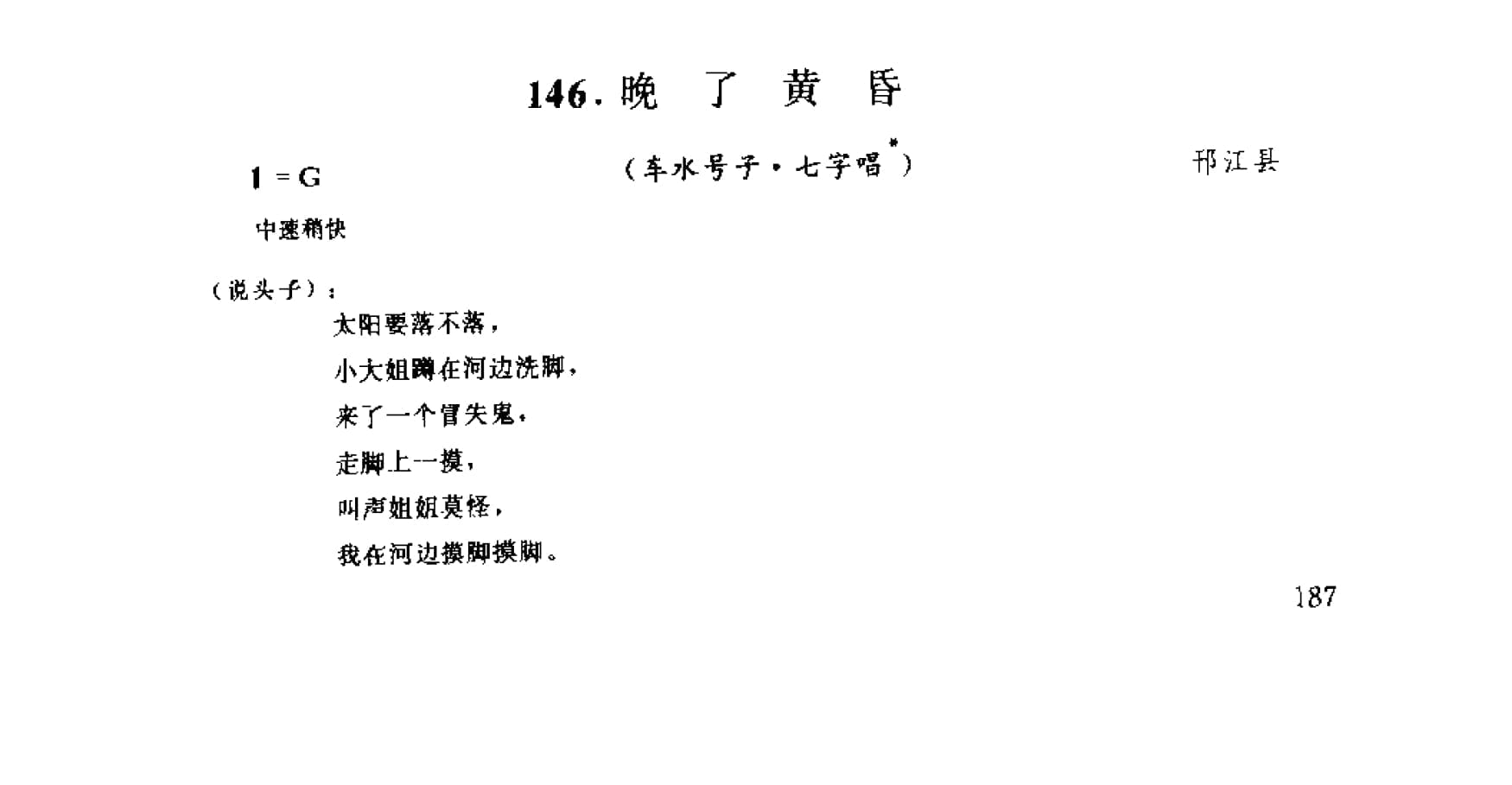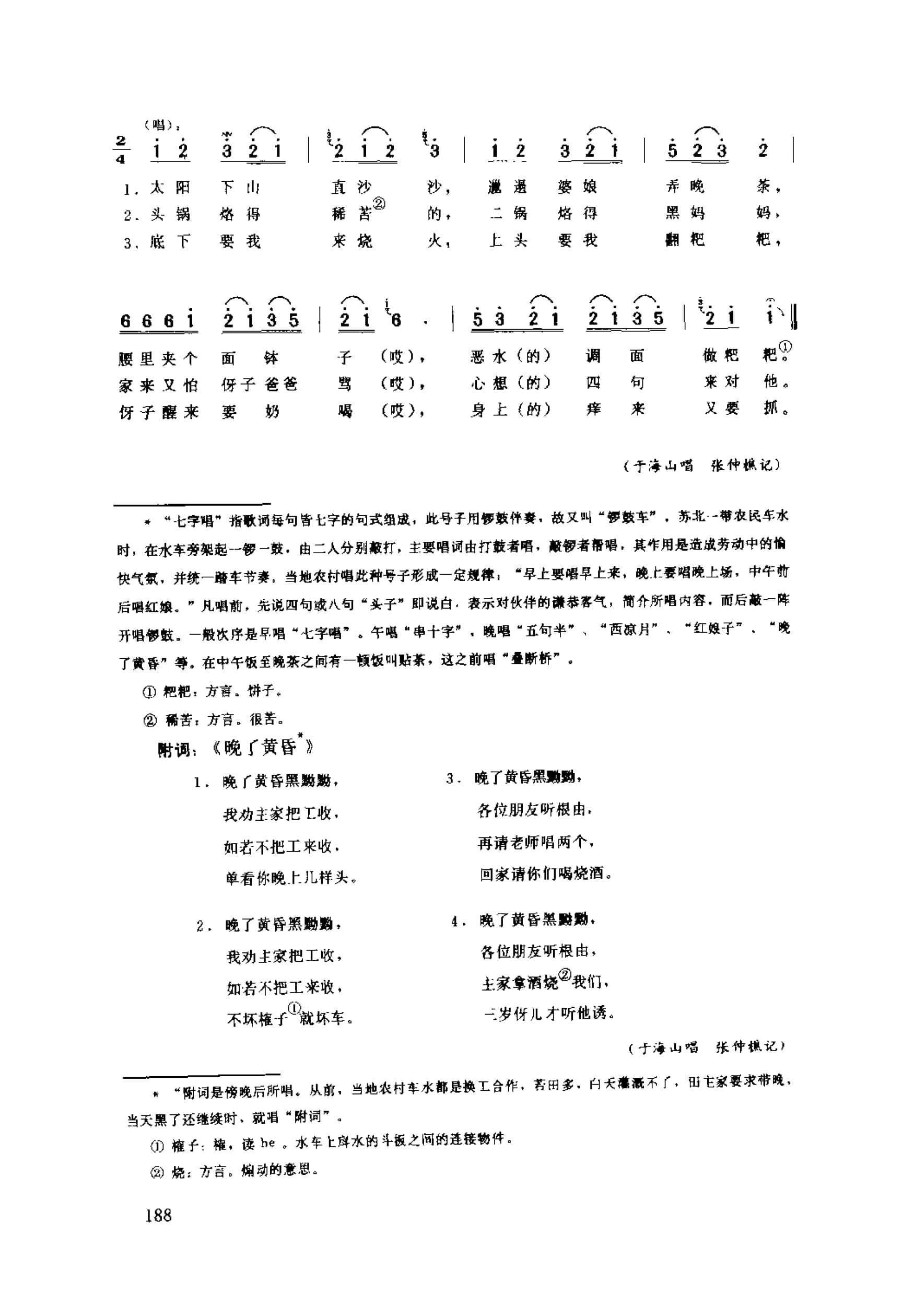 名称:晚了黄昏 车水号子 七字唱 邗江县国家:中国分类:歌谱子类:民歌谱类型:简谱/五线谱文件格式:jpg“附词是傍晚后所唱。从前,当地农村车水都是换工合作,若田多,天不了,出亡家要求带晚。当天黑了还继续时,就唱“附词”①) 権子:耀,读 he 。水车上戽水的斗板之间的连接物件,②)烧:方言。煽动的意思。