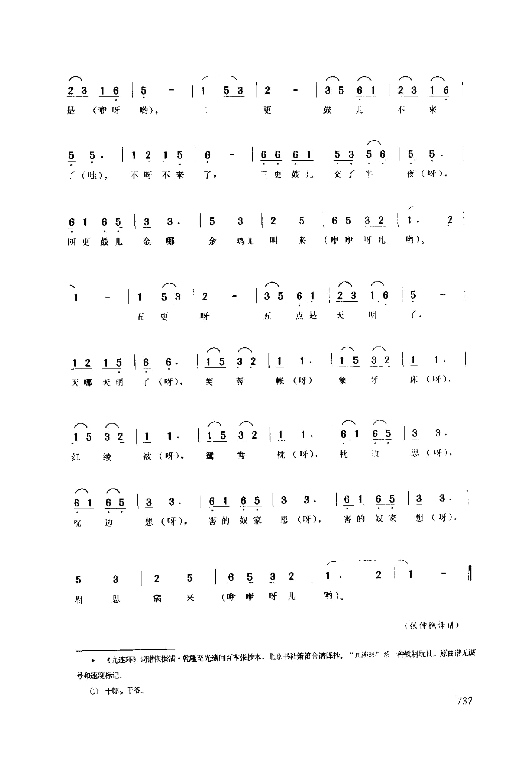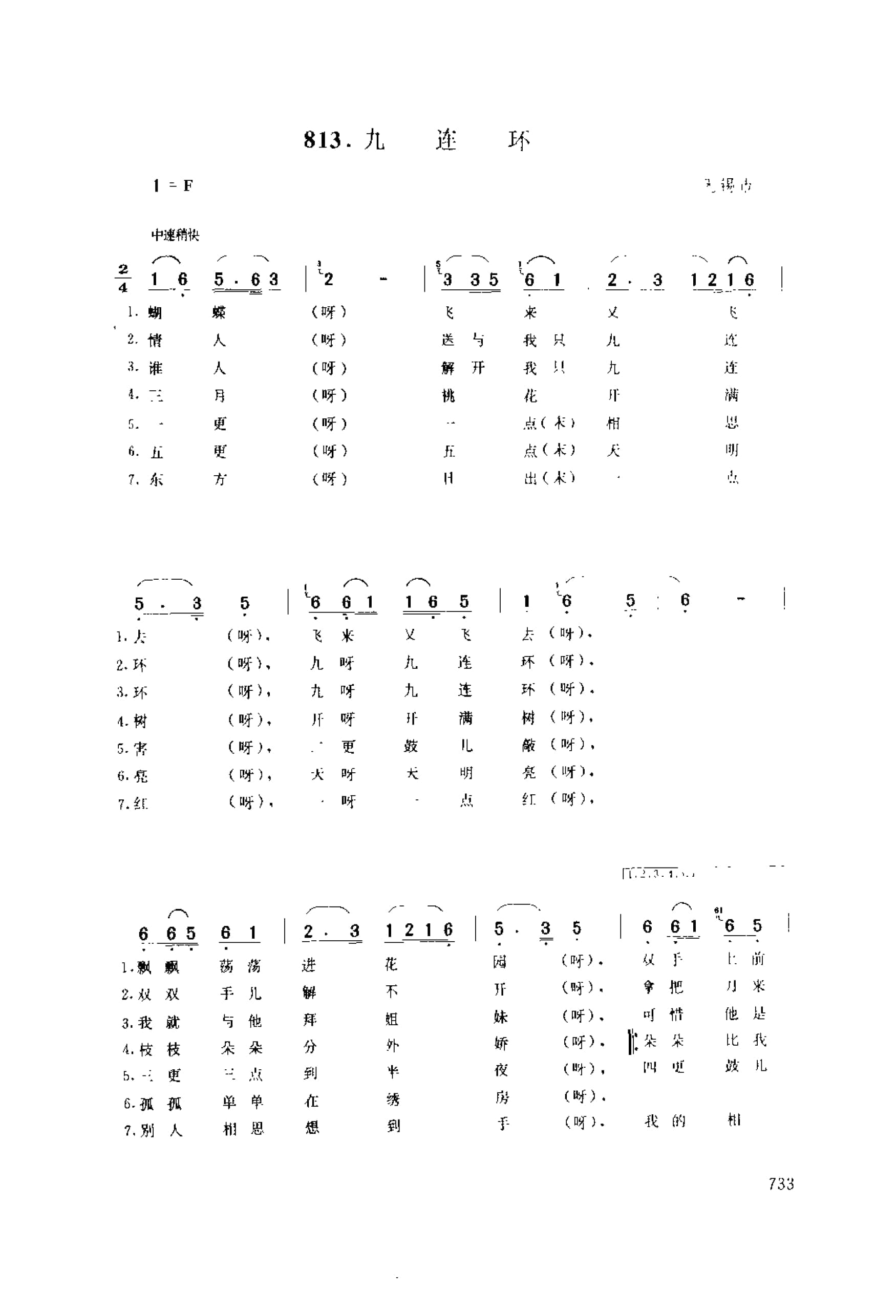 名称:九连环 无锡市国家:中国分类:歌谱子类:民歌谱类型:简谱/五线谱文件格式:jpg九连环 无锡市《九连环》词谱依据清·乾隆至光绪间百本张抄本,北京书社箫苗合讲详抄,“凡连环”系,种铁制玩具。原曲讲龙调号和速度标记
