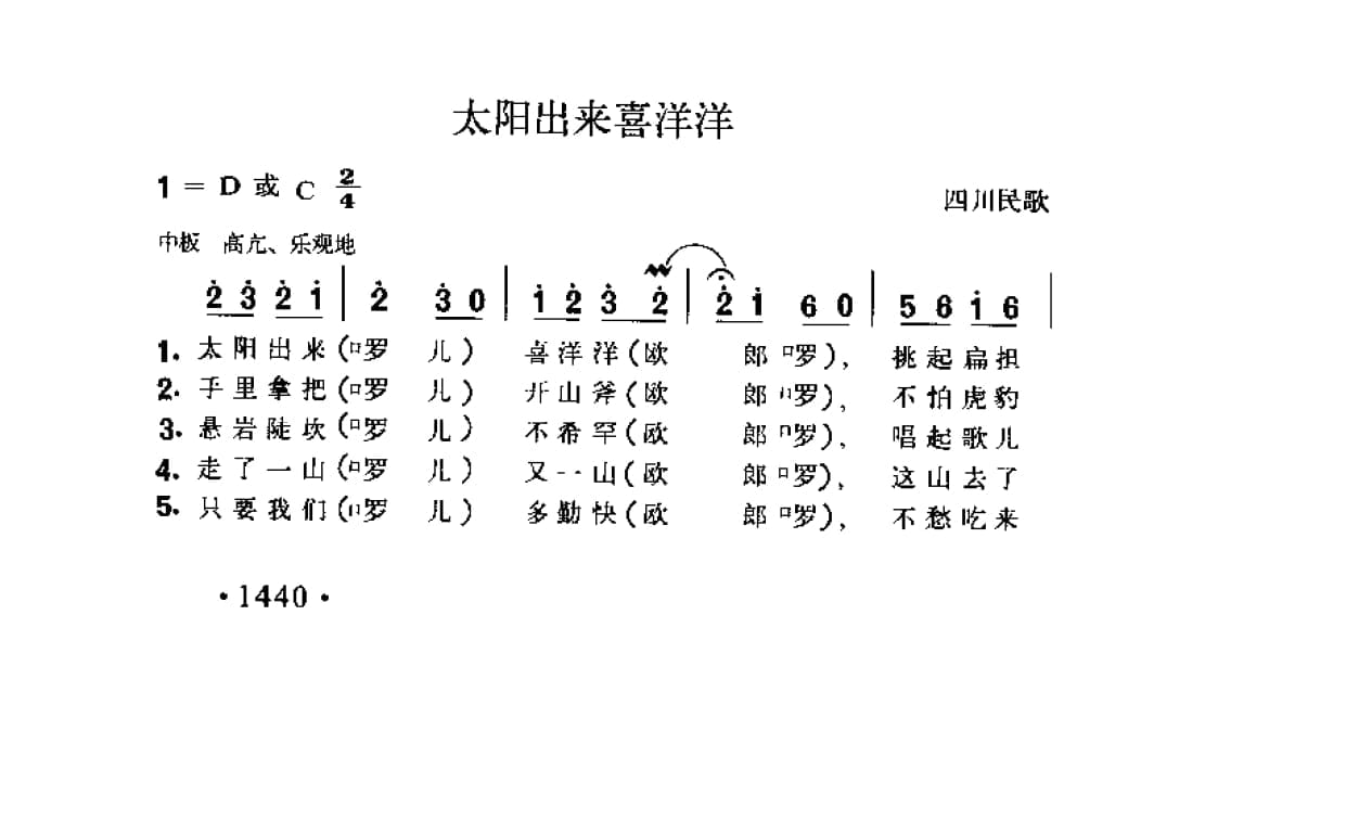 名称:太阳出来喜洋洋 四川民歌国家:中国分类:歌谱子类:民歌谱类型:简谱/五线谱文件格式:jpg