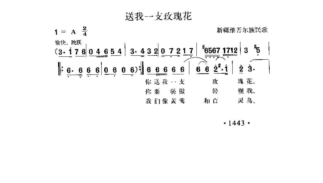名称:送我一支玫瑰花 新疆维吾尔族民歌国家:中国分类:歌谱子类:民歌谱类型:简谱/五线谱文件格式:jpg