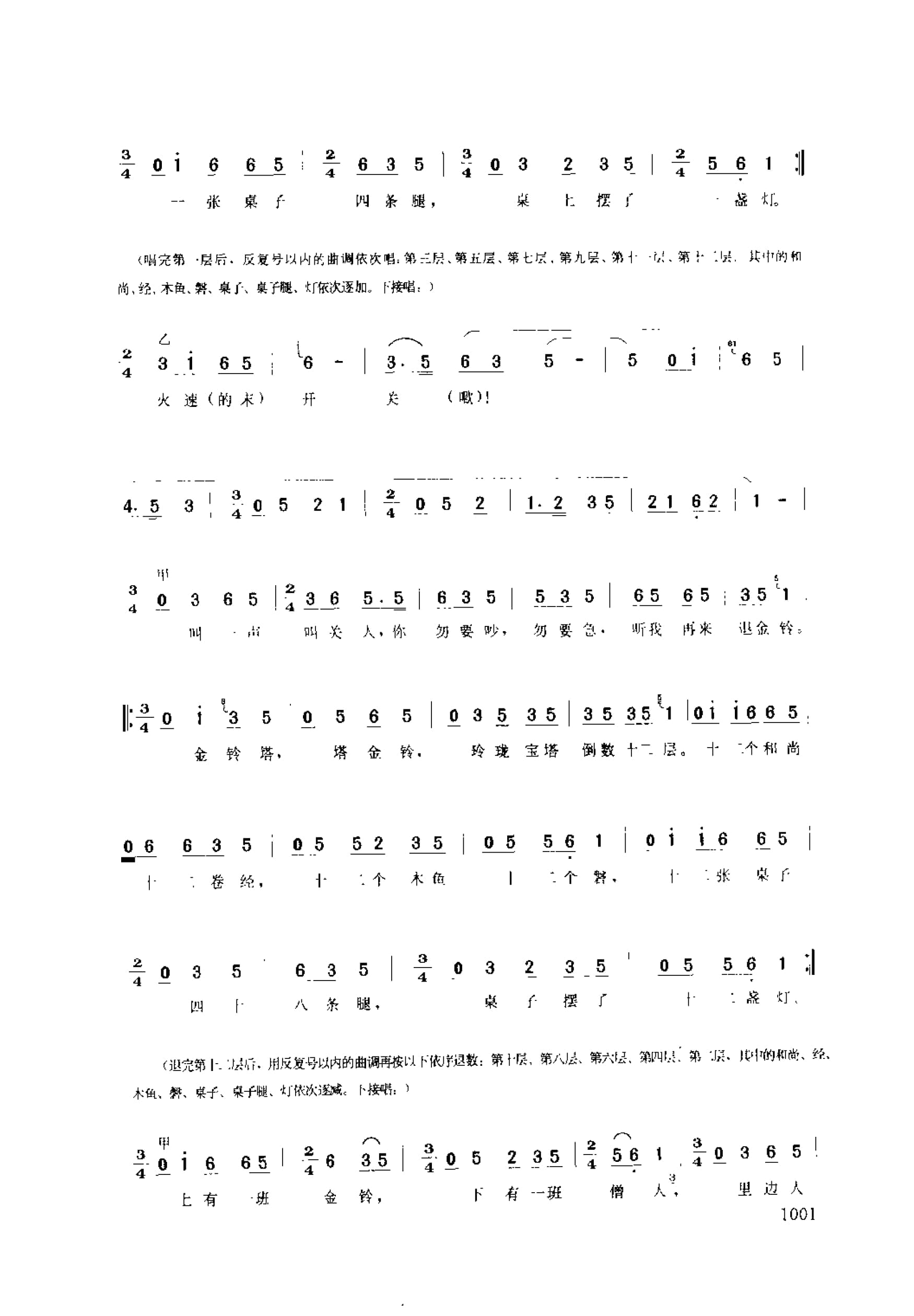 名称:金铃塔 二 苏州市国家:中国分类:歌谱子类:民歌谱类型:简谱/五线谱文件格式:jpg此曲又叫《数金铃》,是苏州滩簧《君出塞》中门官和马夫的唱段,甲总门官,是马夫,此处指旧制·斤为十六两。②)格求来哉:方言。那么来厂@、“上有一一斑金铃,下有一班僧人”,另词为“点起灯来些盏明、诵起经来朗朗声”。此段曲调近口语、节拍自由。演明者可以根据需要扩充或缩溅节拍时值。