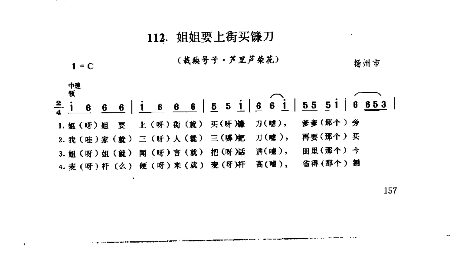 名称:姐姐要上街买镰刀 栽秧号子 芦里芦柴花 扬州市国家:中国分类:歌谱子类:民歌谱类型:简谱/五线谱文件格式:jpg