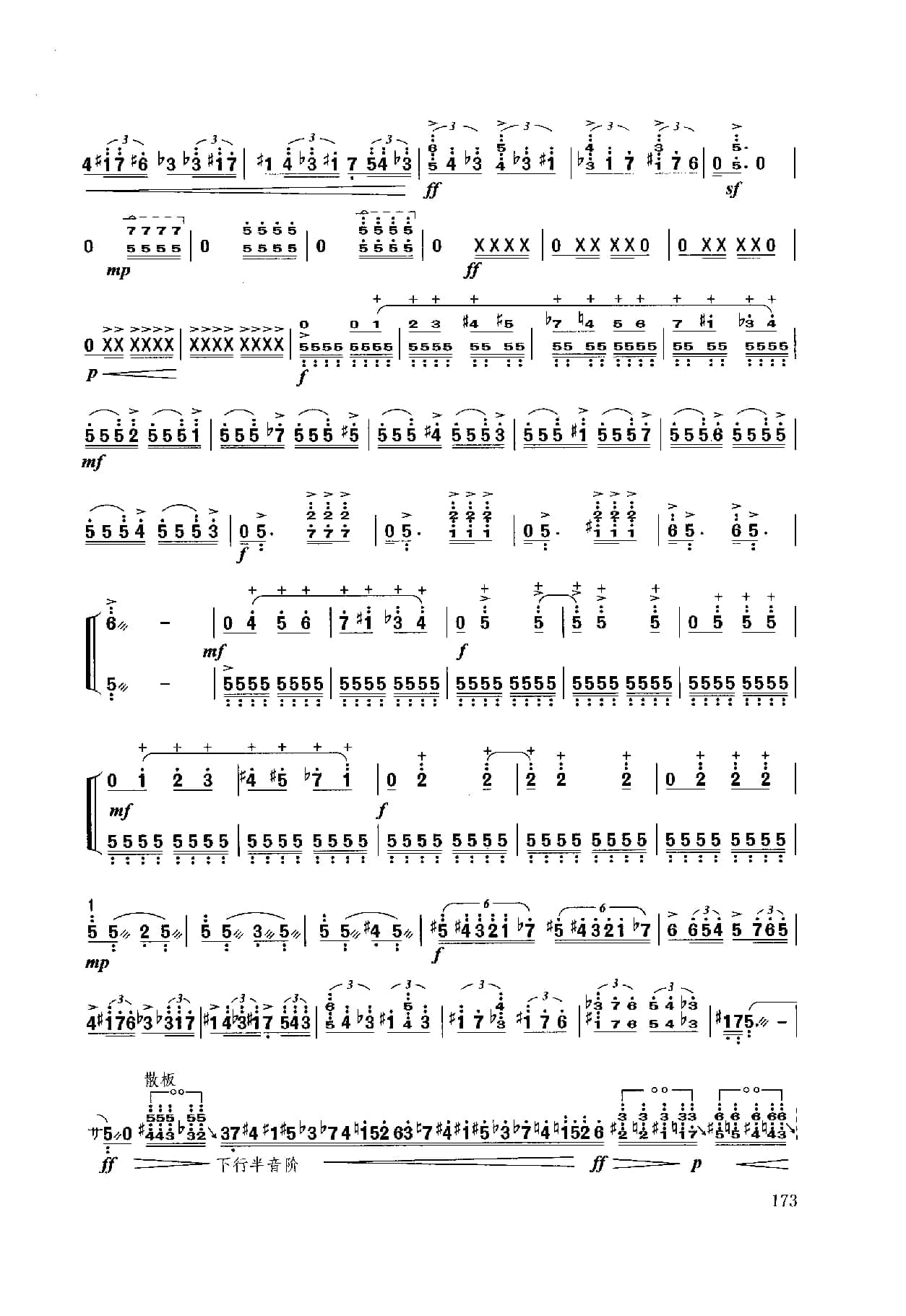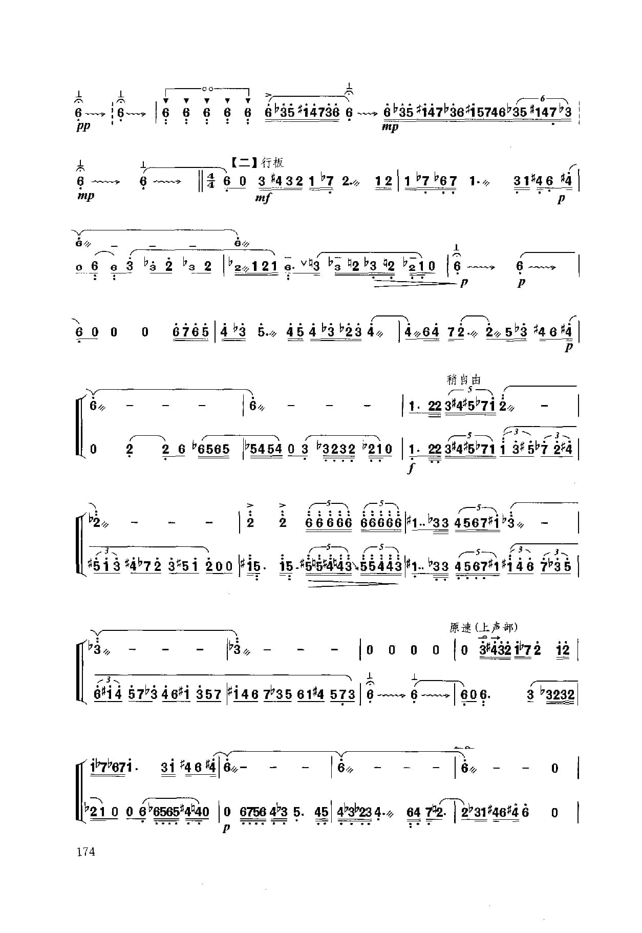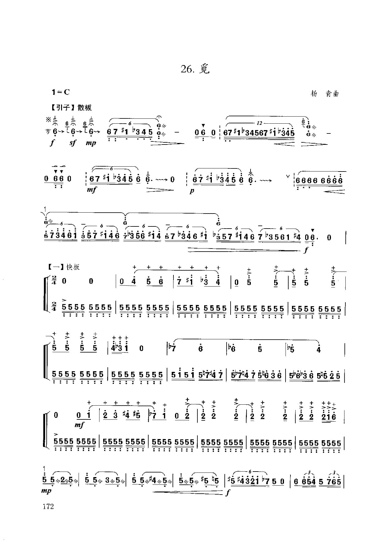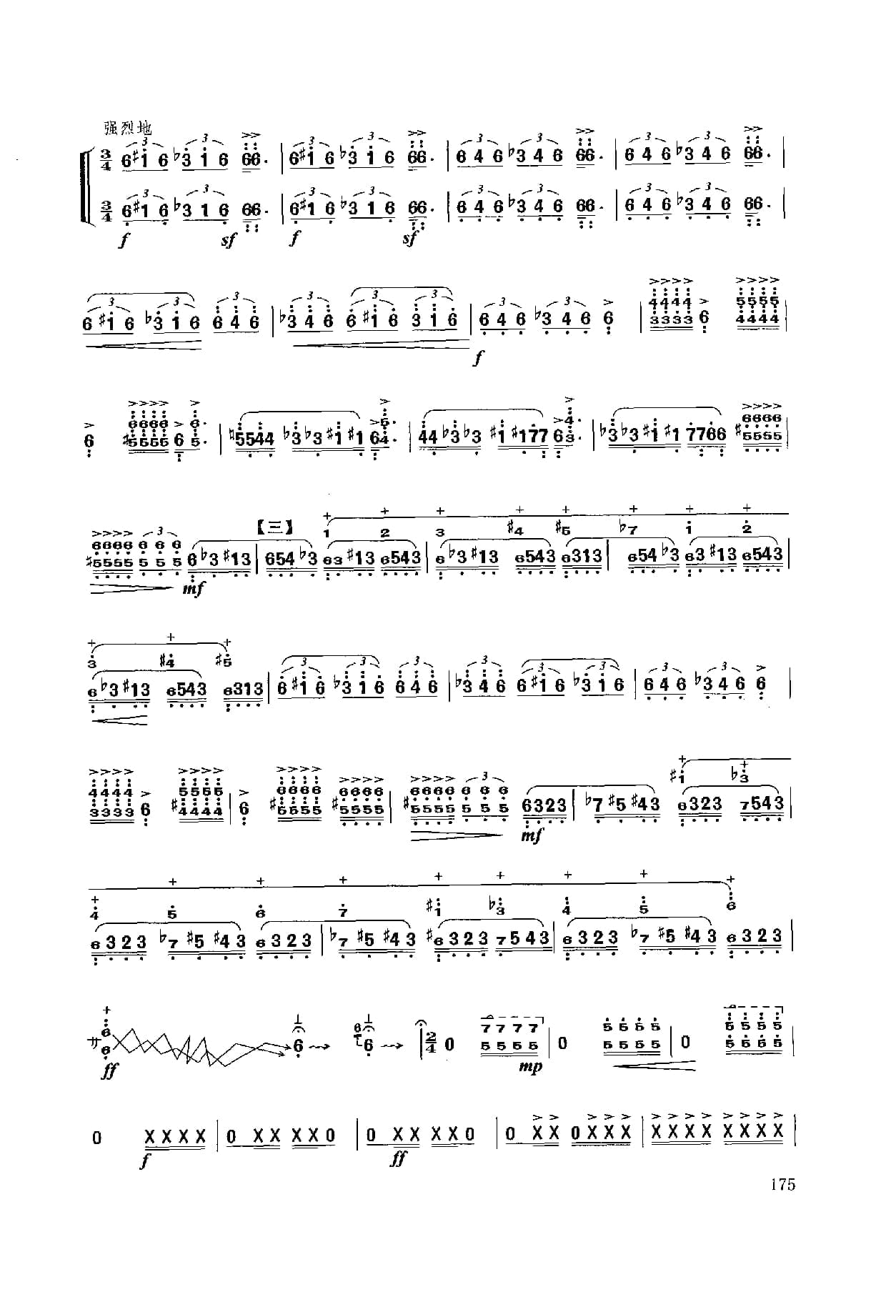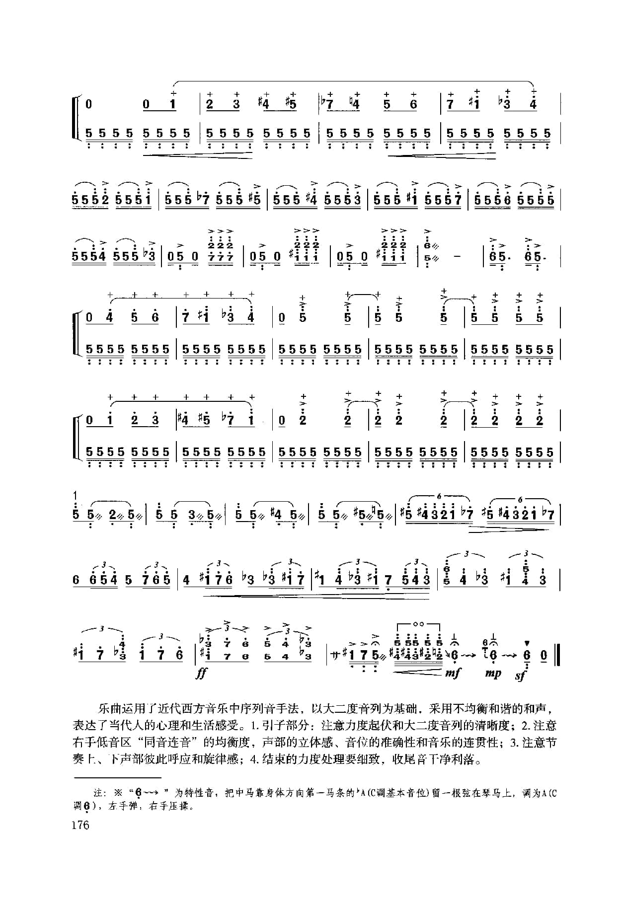 名称:扬琴经典曲目简谱:觅 杨青曲国家:中国分类:民族乐器谱子类:扬琴谱类型:简谱文件格式:jpg乐曲运用了近代西方音乐中序列音手法,以大二度音列为基础,采用不均衡和谐的和声表达了当代人的心理和生活感受。1.引子部分:注意力度起伏和大二度音列的清晰度;2.注意右于低音区“同音连音”的均衡度,声部的立体感、音位的准确性和音乐的连贯性;3.注意节奏上、下声部彼此呼应和旋律感;4.结束的力度处理要细致,收尾音干净利落。