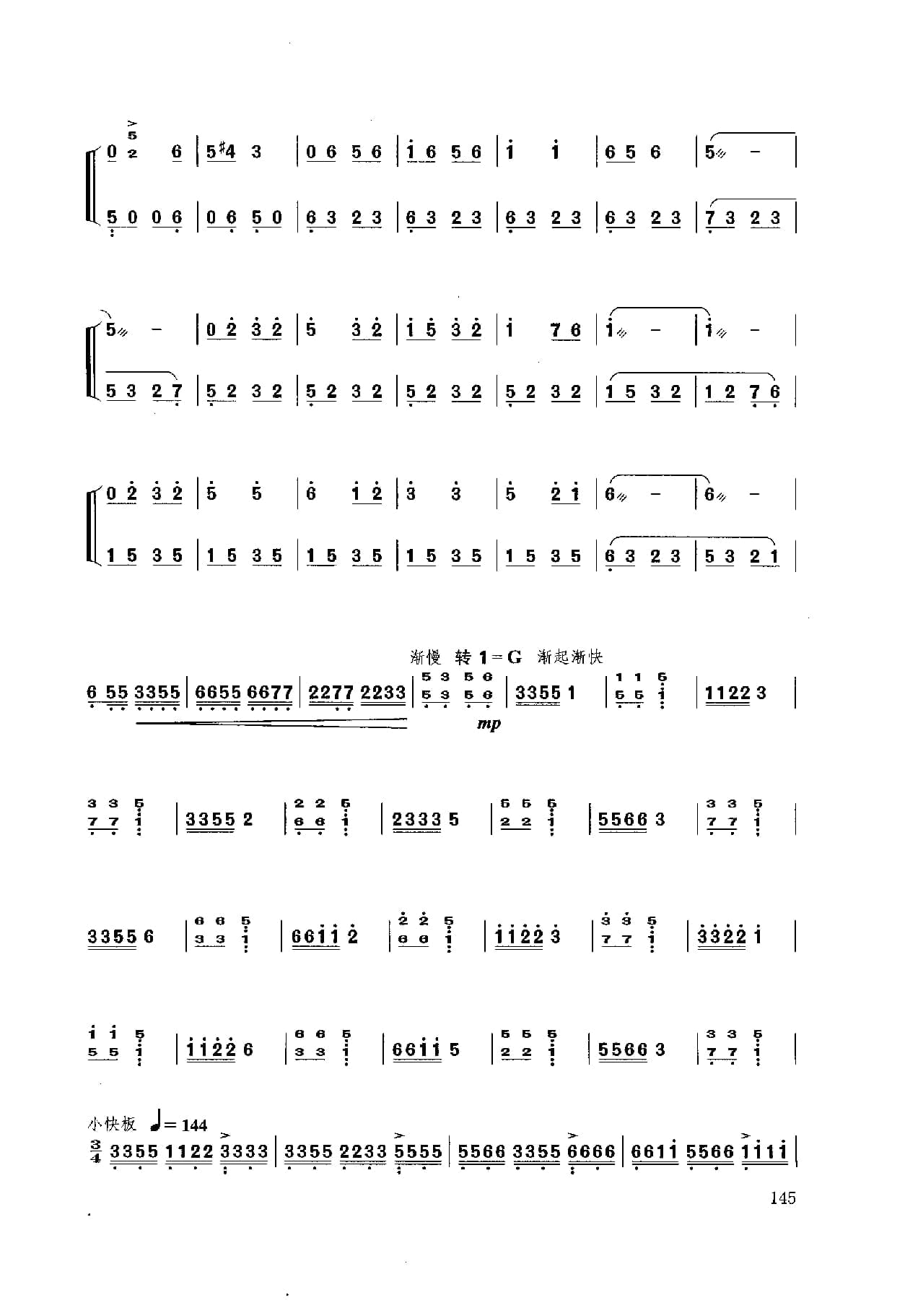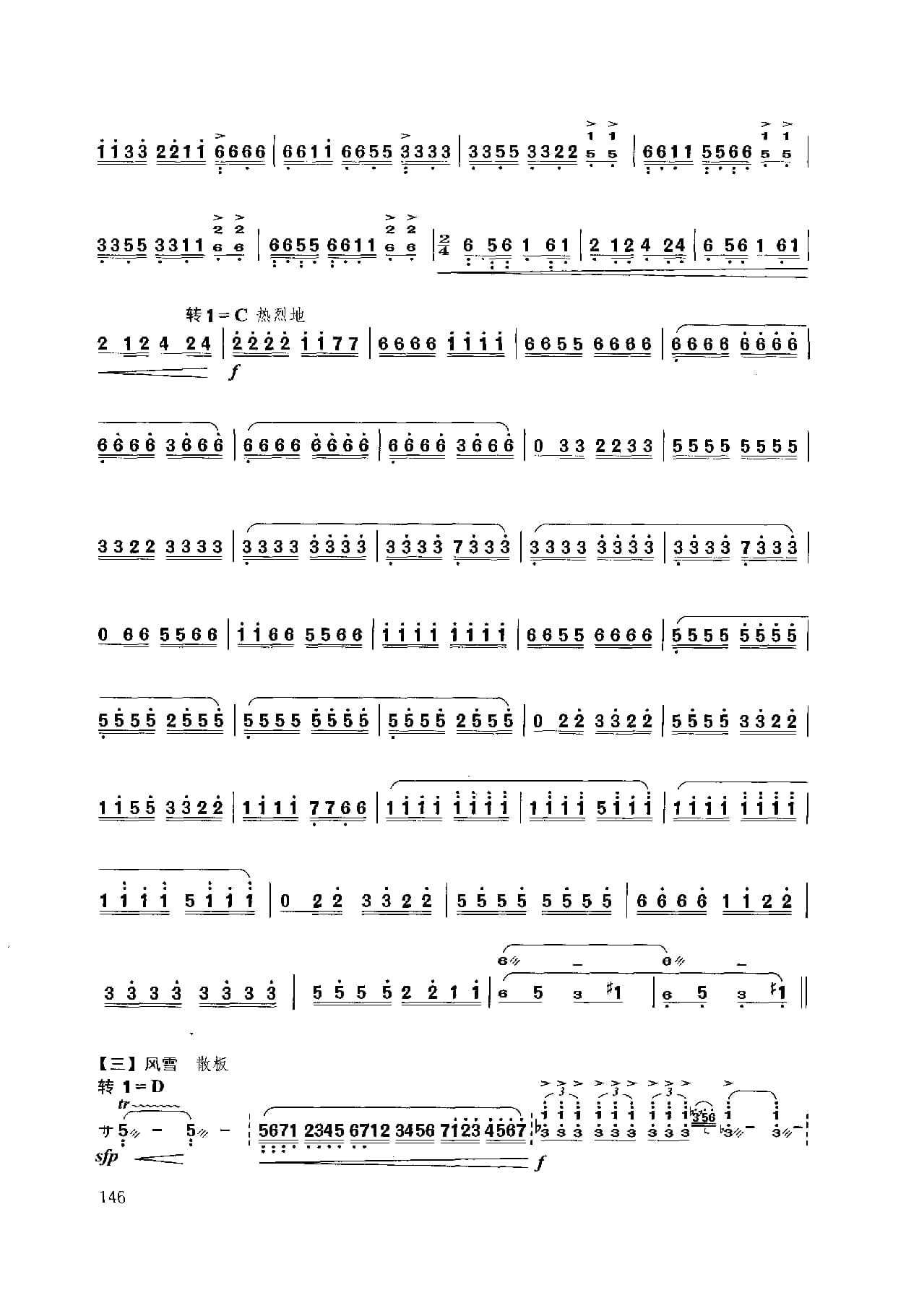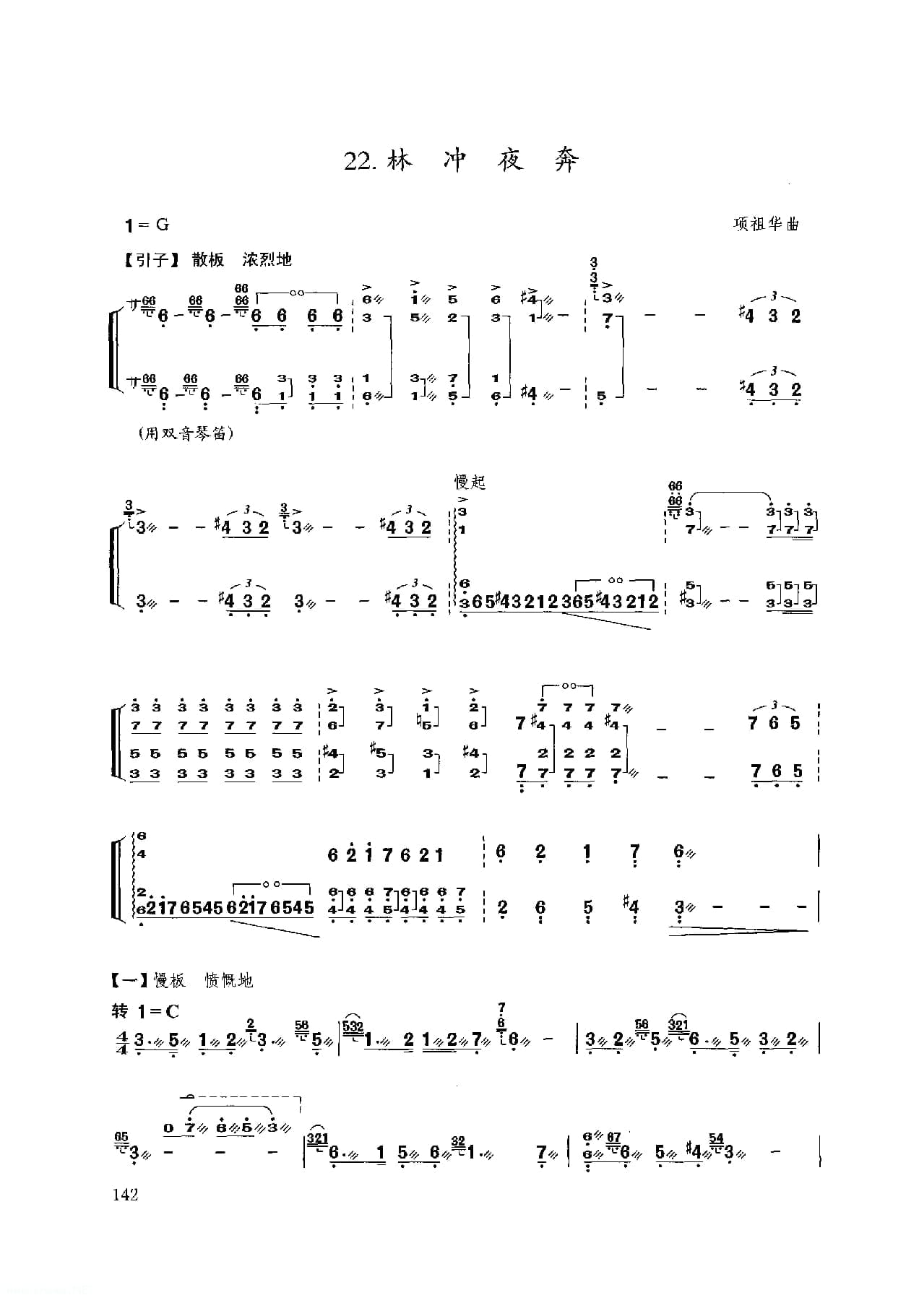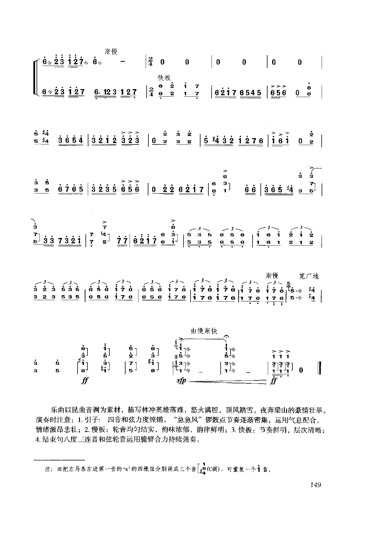 名称:扬琴经典曲目简谱:林冲夜奔 项祖华曲国家:中国分类:民族乐器谱子类:扬琴谱类型:简谱文件格式:jpg乐曲以昆曲音调为素材,描写林冲英雄落难,怒火满腔,顶风踏雪,夜奔梁山的豪情壮举演奏时注意:1.引子: 四音和弦力度铿锵,“急急风”锣鼓点节奏逐渐密集,运用气息配合,情绪激昂悲壮;2.慢板:轮音均匀结实,韵味浓郁,韵律鲜明;3.快板:节奏鲜明,层次清晰;4.结束句八度二连音和弦轮音运用脆臂合力持续强奏。